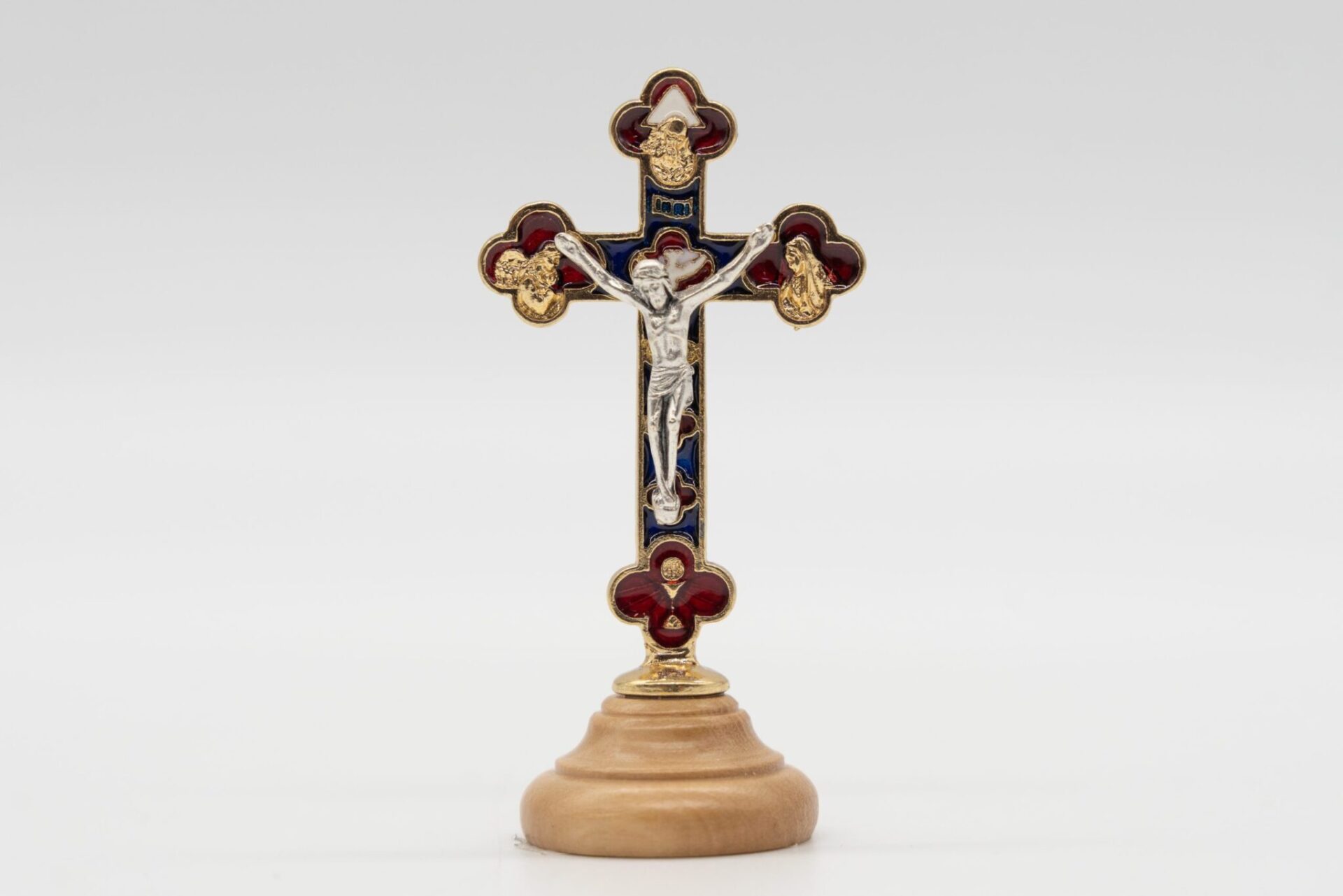 Crocifisso Trilobato SS. Trinità da appoggio con base in pregiato legno di ulivo Nazionale con Cristo in metallo argentato e smalto finemente lavorato e curato nei dettagli.