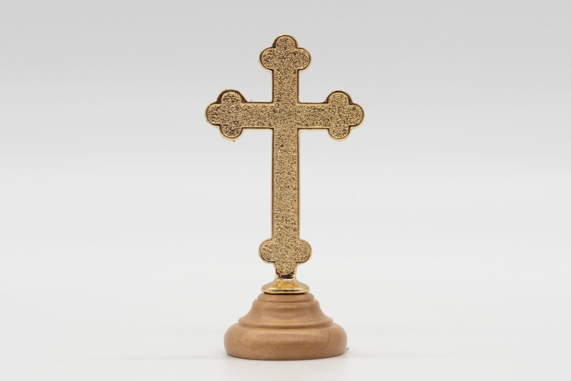 La base del crocifisso è in legno d’ulivo e a gradini, creando una solida piattaforma per sostenere la croce.