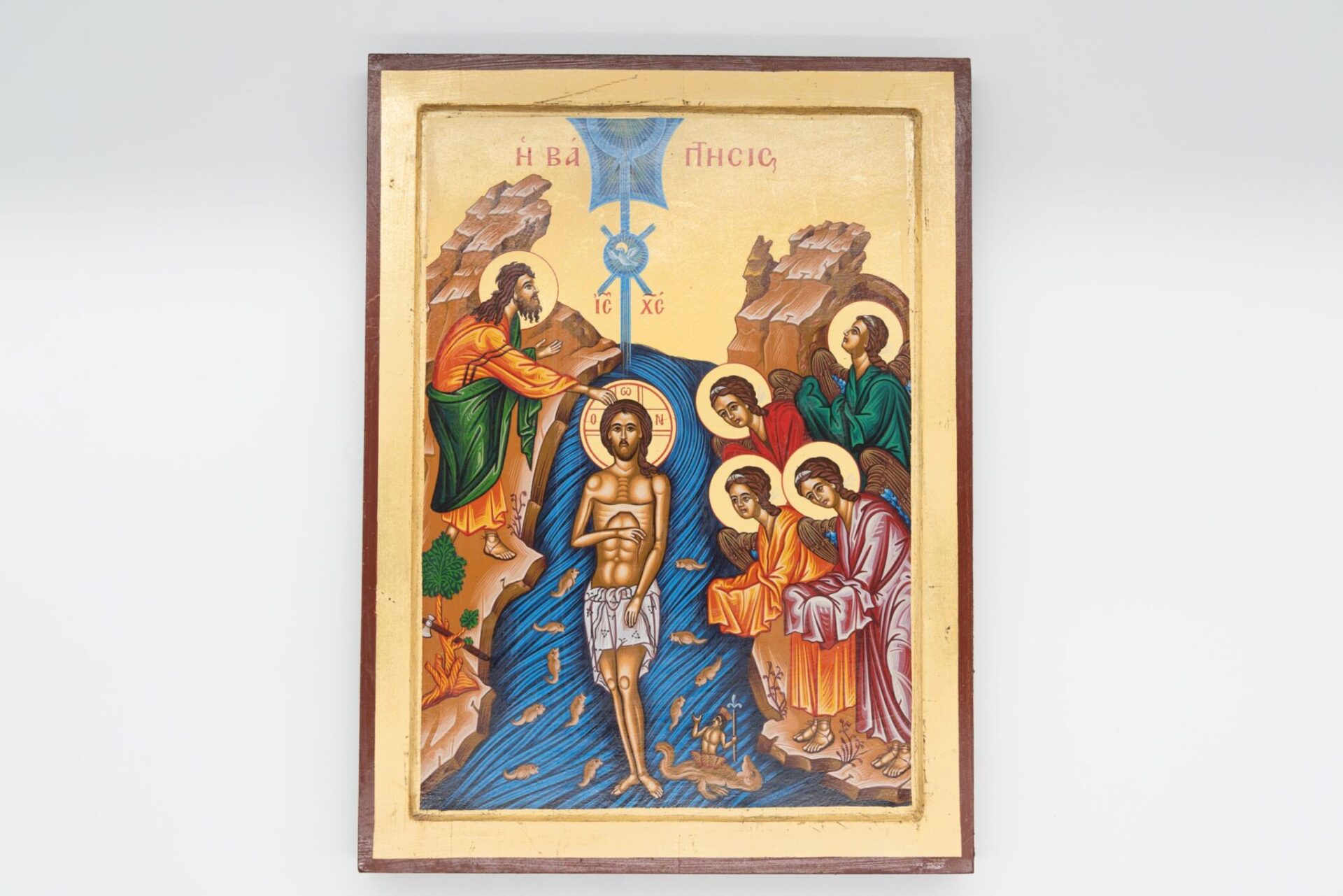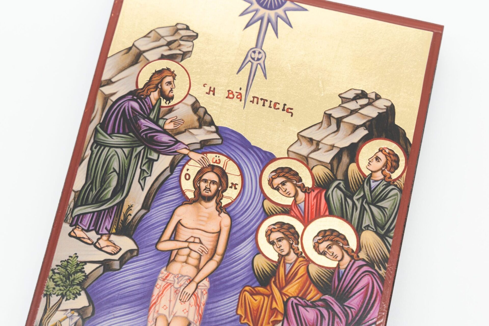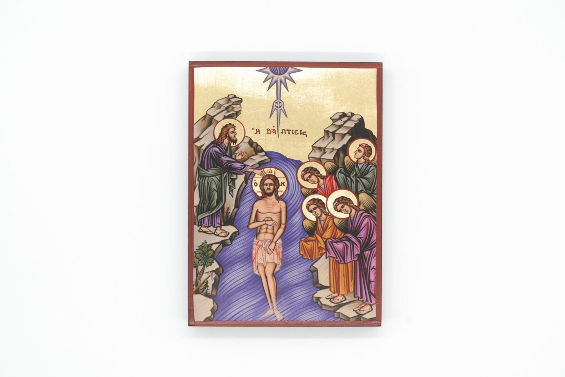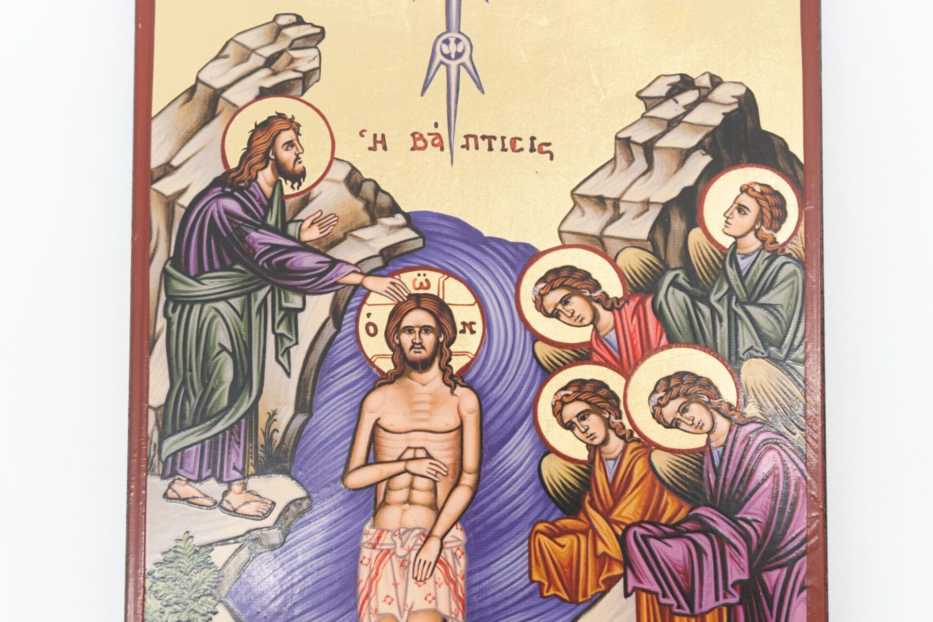 Il testo nell’immagine è in greco e recita “Η ΒΑΠΤΙΣΙΣ,” che si traduce in “Il Battesimo.” Icona significativa nella tradizione cristiana poiché rappresenta il momento in cui Gesù fu battezzato, segnando l’inizio del suo ministero pubblico.