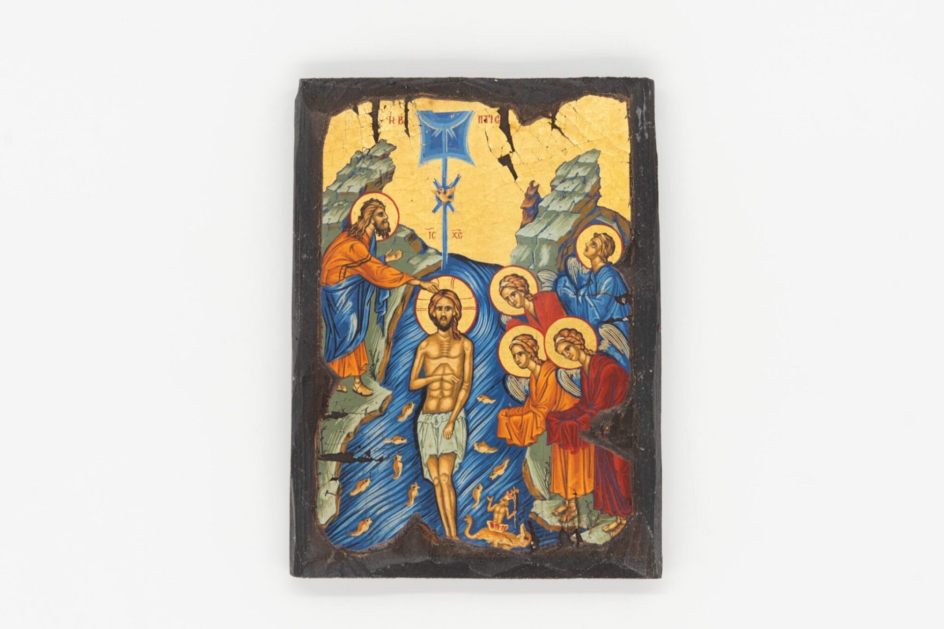 Icona, rifinita a mano su legno, raffigurante il Battesimo di Gesù nel Giordano, il fondo è su foglia oro.