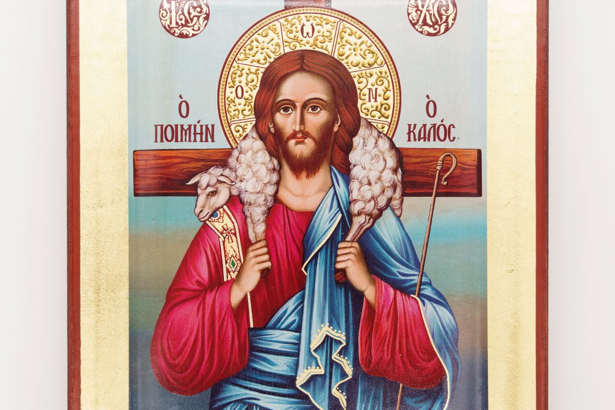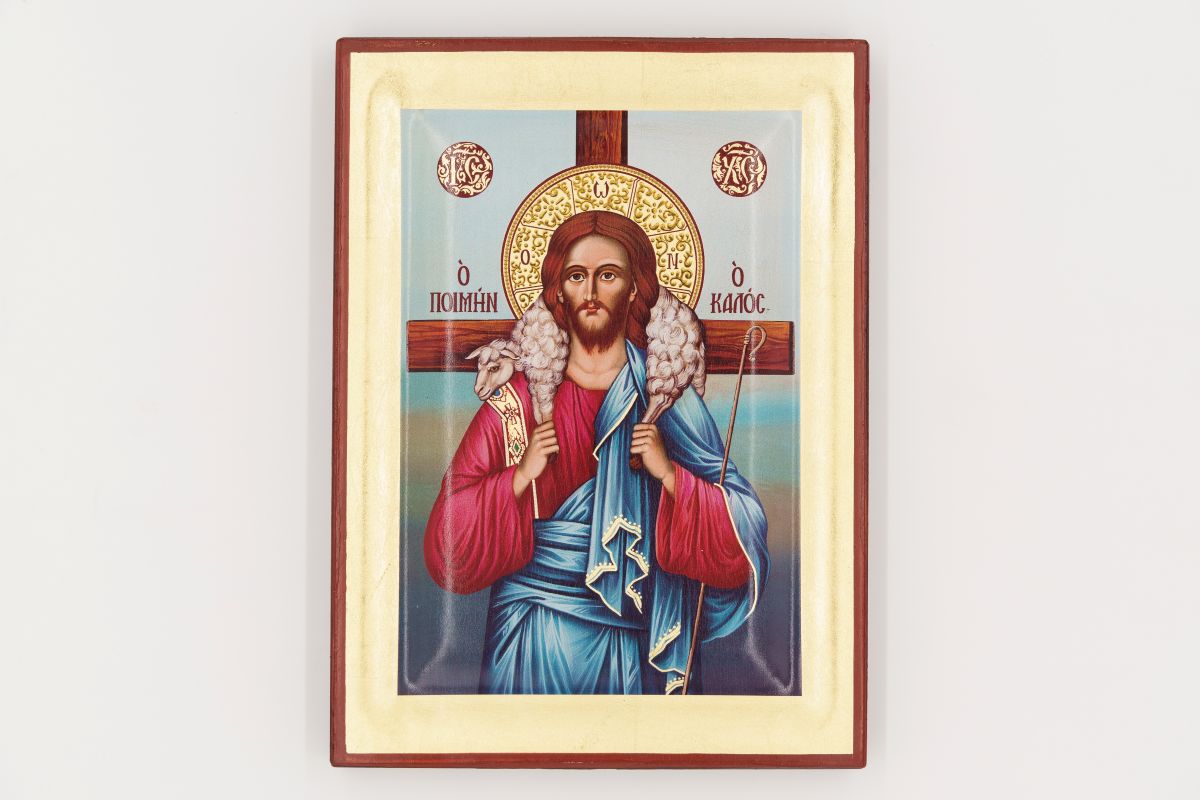 Sullo sfondo c’è una croce. Ai lati della testa di Gesù ci sono le scritte in greco “Ο ΠΟΙΜΗΝ” e “Ο ΚΑΛΟΣ”, che significano “Il Buon Pastore”. È un’affascinante rappresentazione del tema del Buon Pastore, molto diffuso nella tradizione cristiana, che sottolinea l’amore e la cura di Gesù per i suoi seguaci.