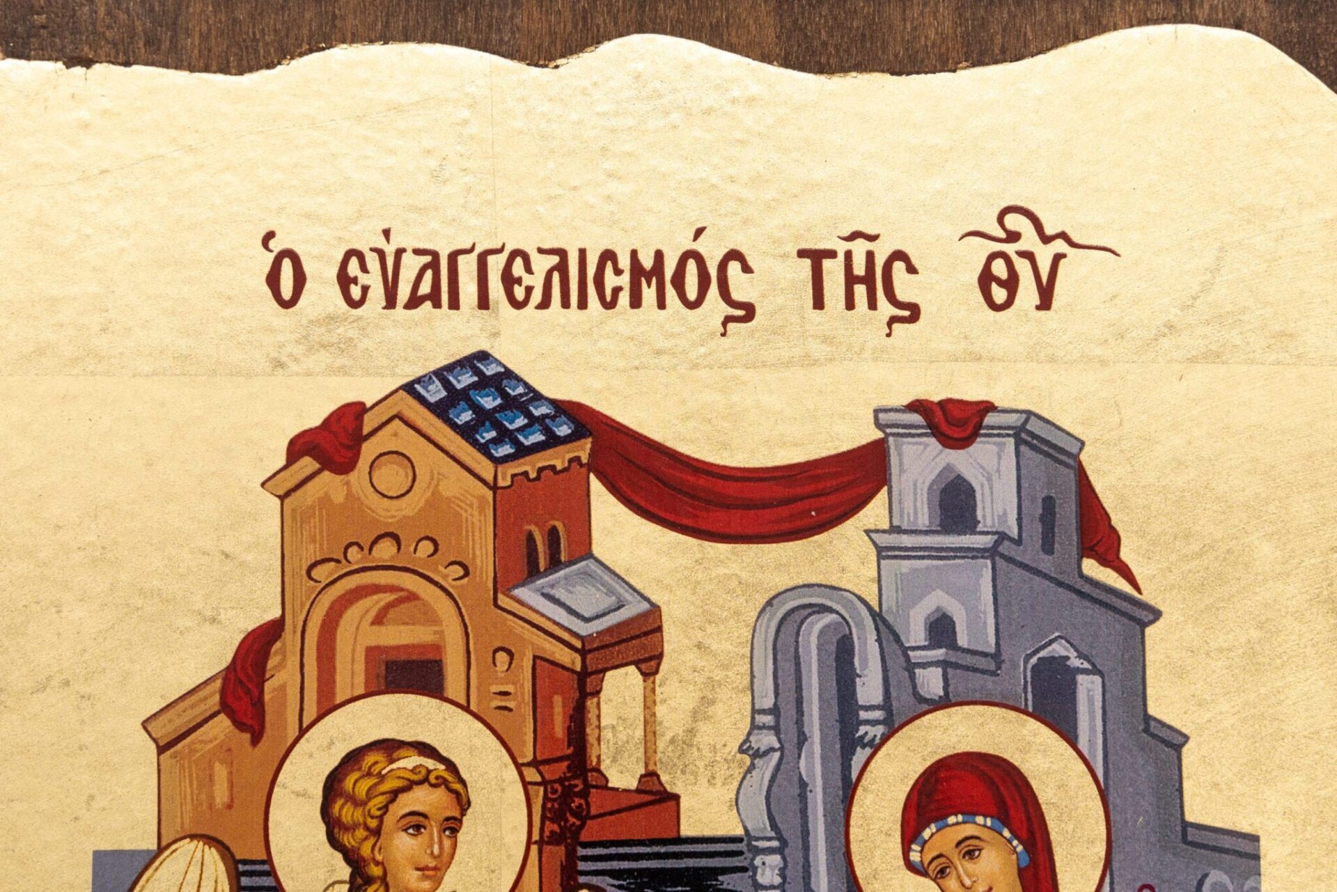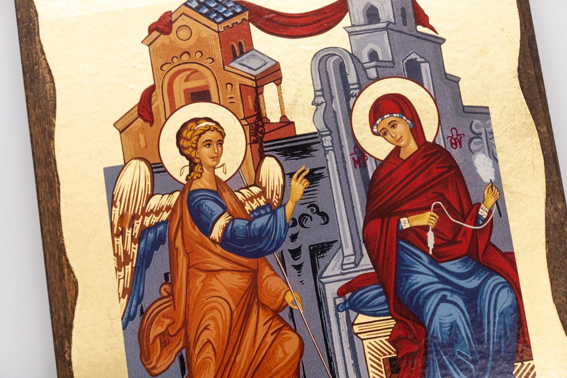 Icona Greca su tavola di legno secondo le antiche norme iconografiche bizantine che raffigura l’Annunciazione dell’angelo Gabriele a Maria Vergine, caratteristico il fondo oro dal bordo frastagliato.
