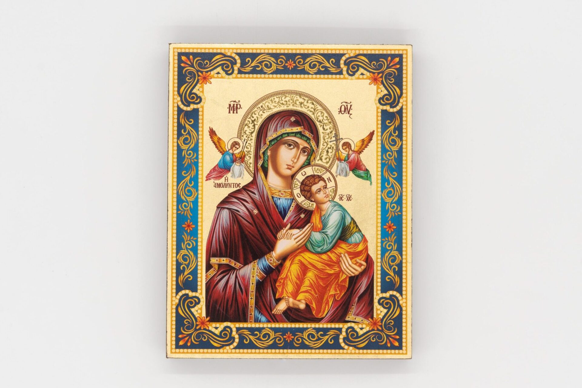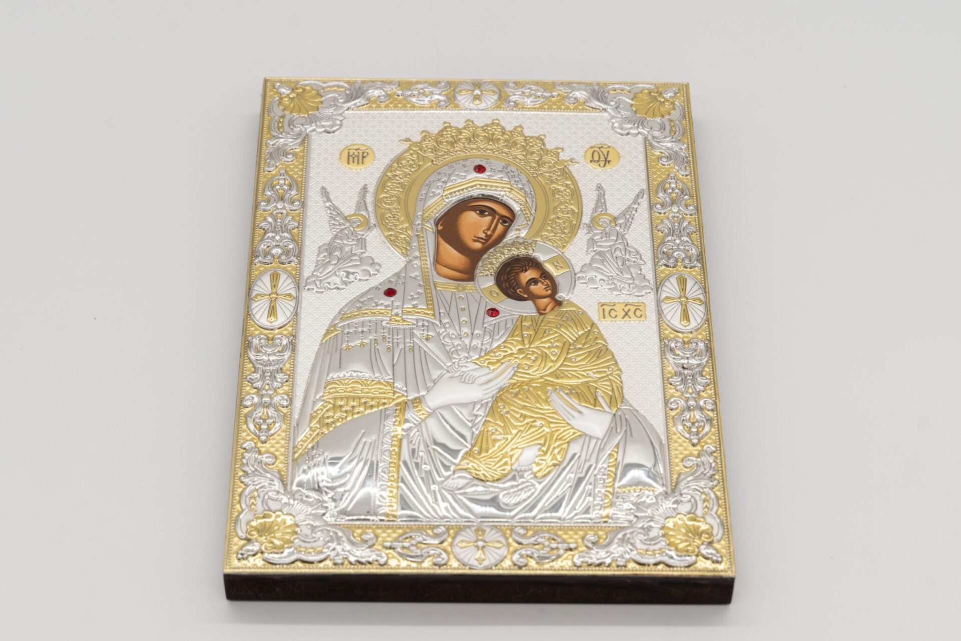 L’icona greca della Madonna con bambino in argento 925 è dotata di un piedino sul retro con un piccolo piede pieghevole, che permette di esporla su una superficie piana.
