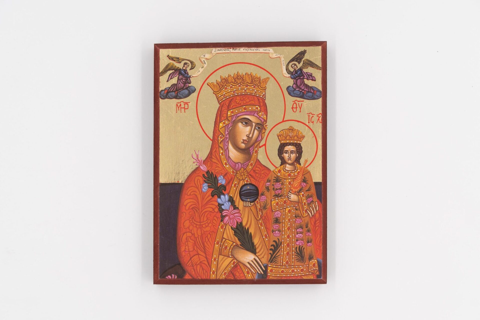 L’icona è decorata con dettagli in oro e argento, con alcune pietre rosse incastonate. La Madonna è rappresentata con un’aureola dorata intricata, e tiene in braccio il Bambino Gesù, anch’egli con un’aureola dorata. Ai lati della Madonna ci sono due angeli in argento. Nell’angolo in alto a sinistra ci sono le lettere greche “ΜΡ ΘΥ” (abbreviazione di “Madre di Dio”), e nell’angolo in alto a destra ci sono le lettere “ΙC XC” (abbreviazione di “Gesù Cristo”).