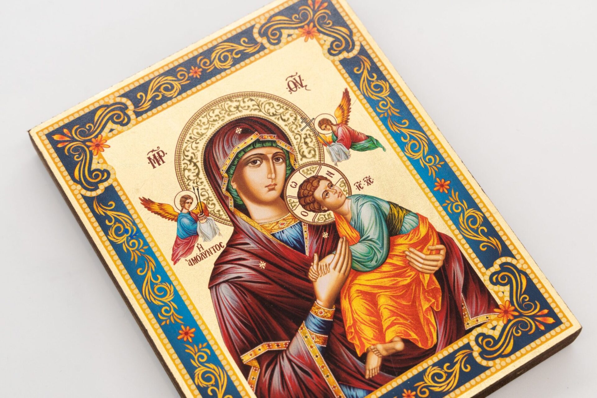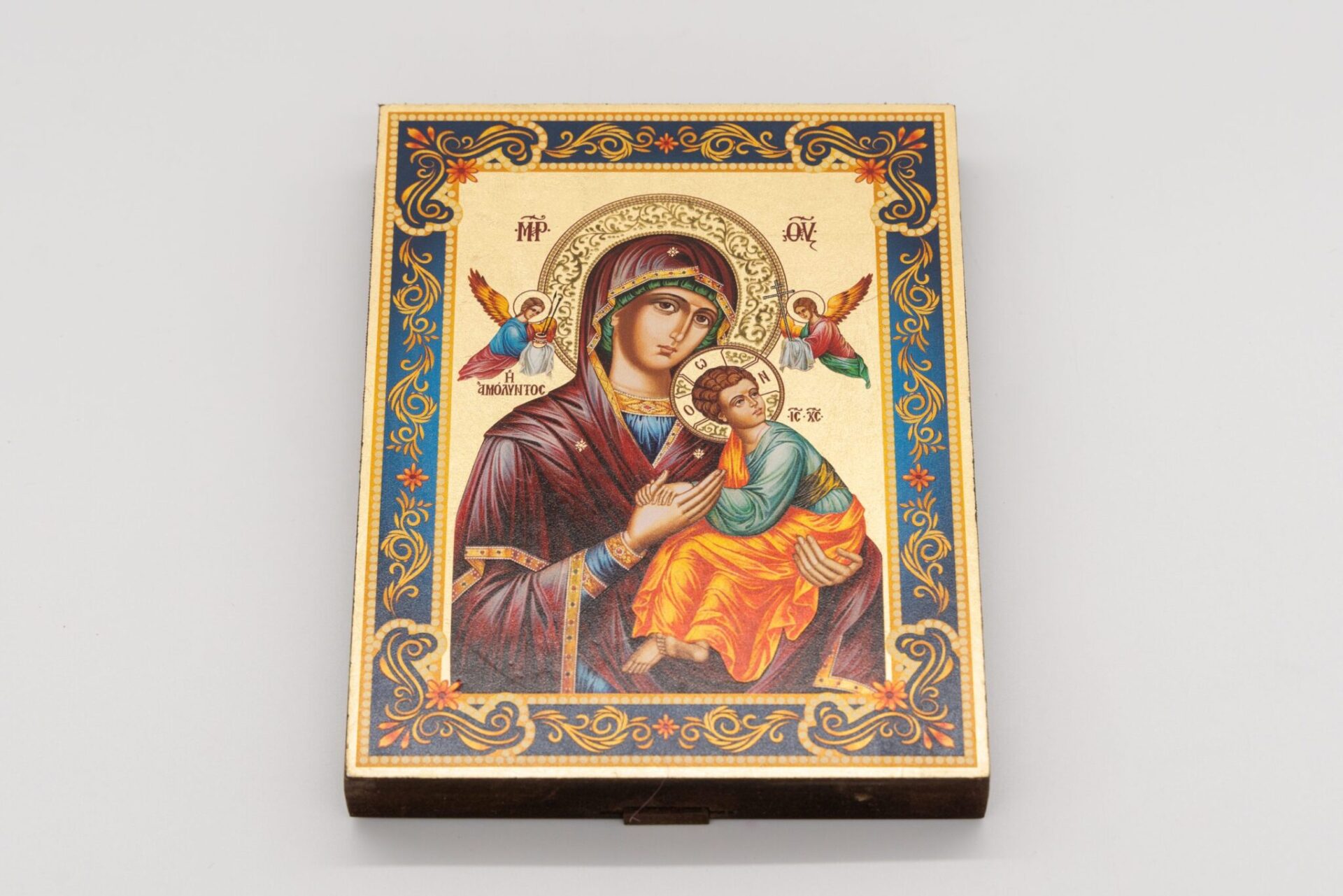 Icona rifinita a mano su legno raffigurante la Madonna con Bambino.