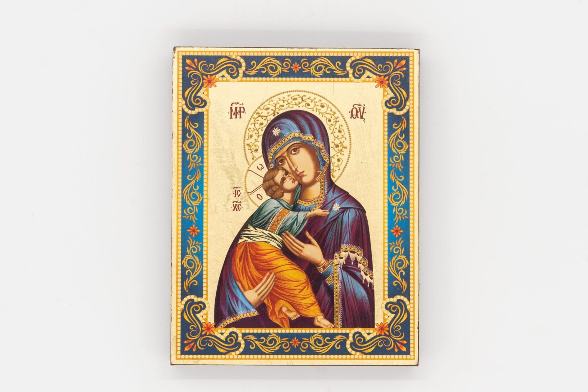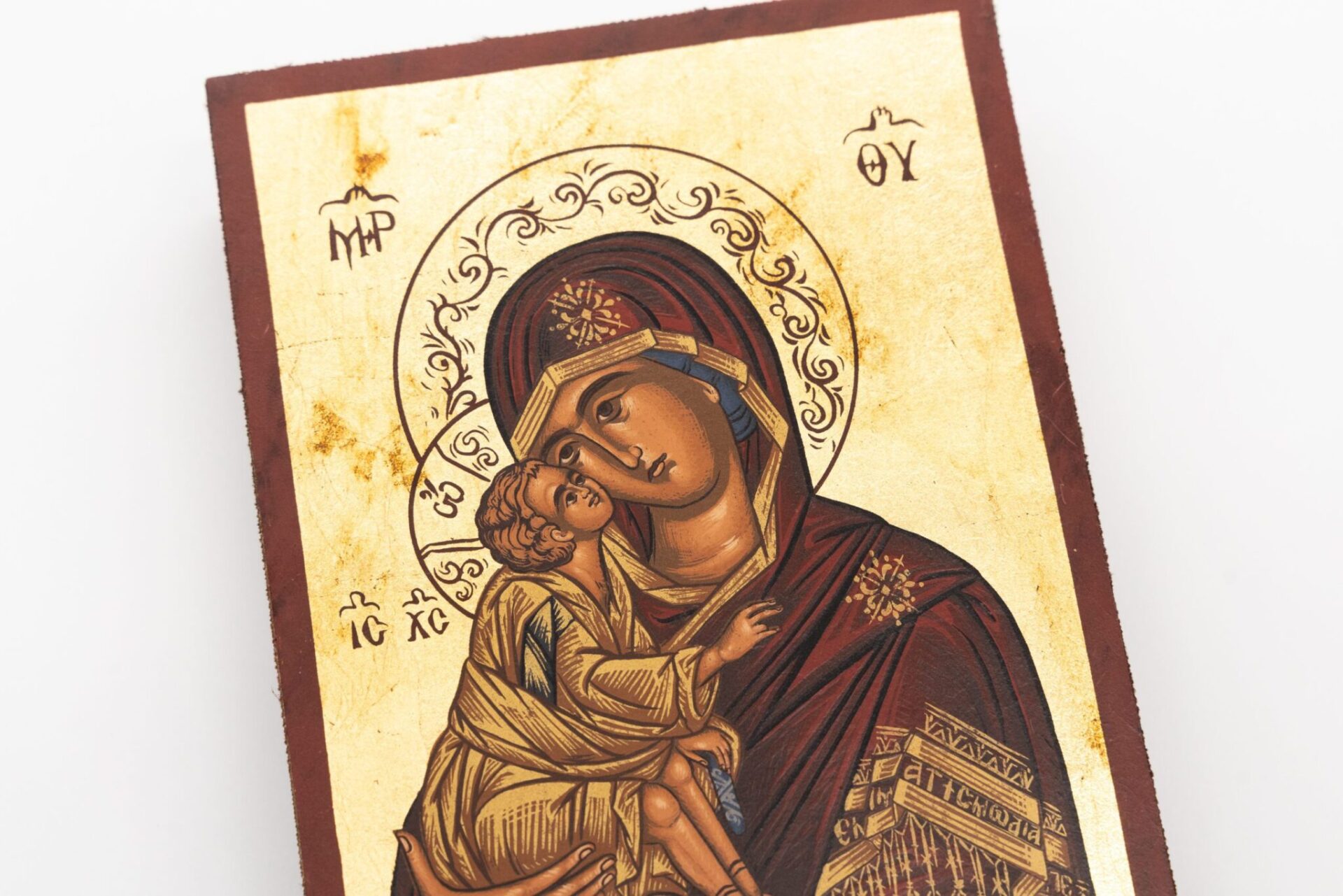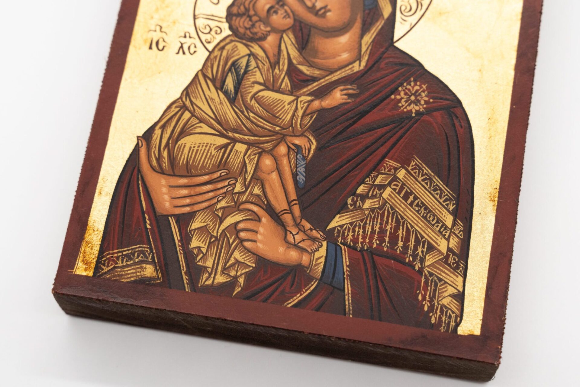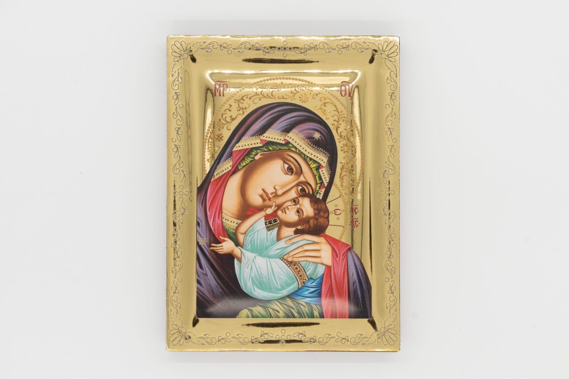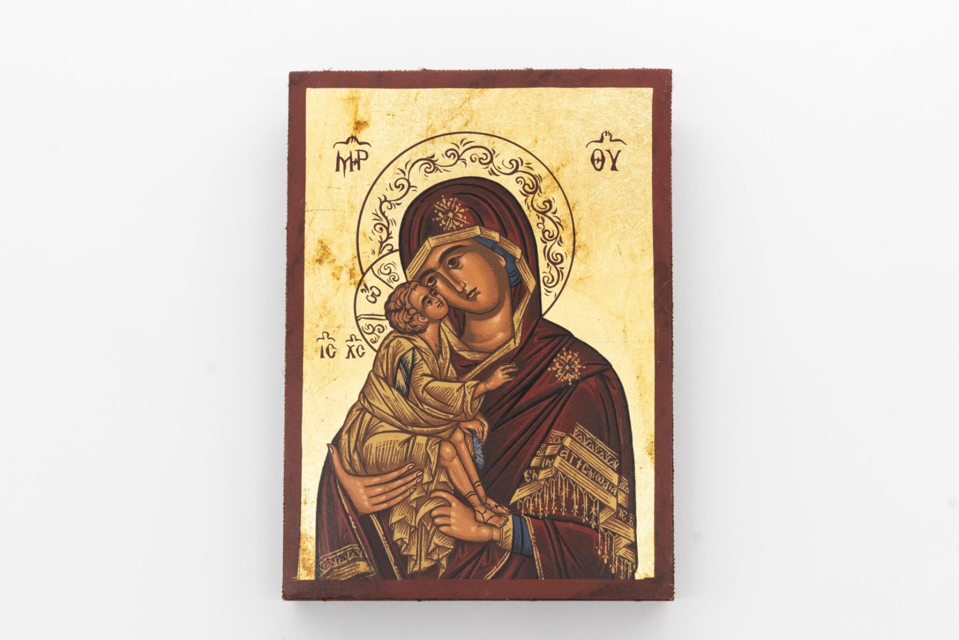 Questa icona è una litografia su legno e rifinita con foglia d’oro.