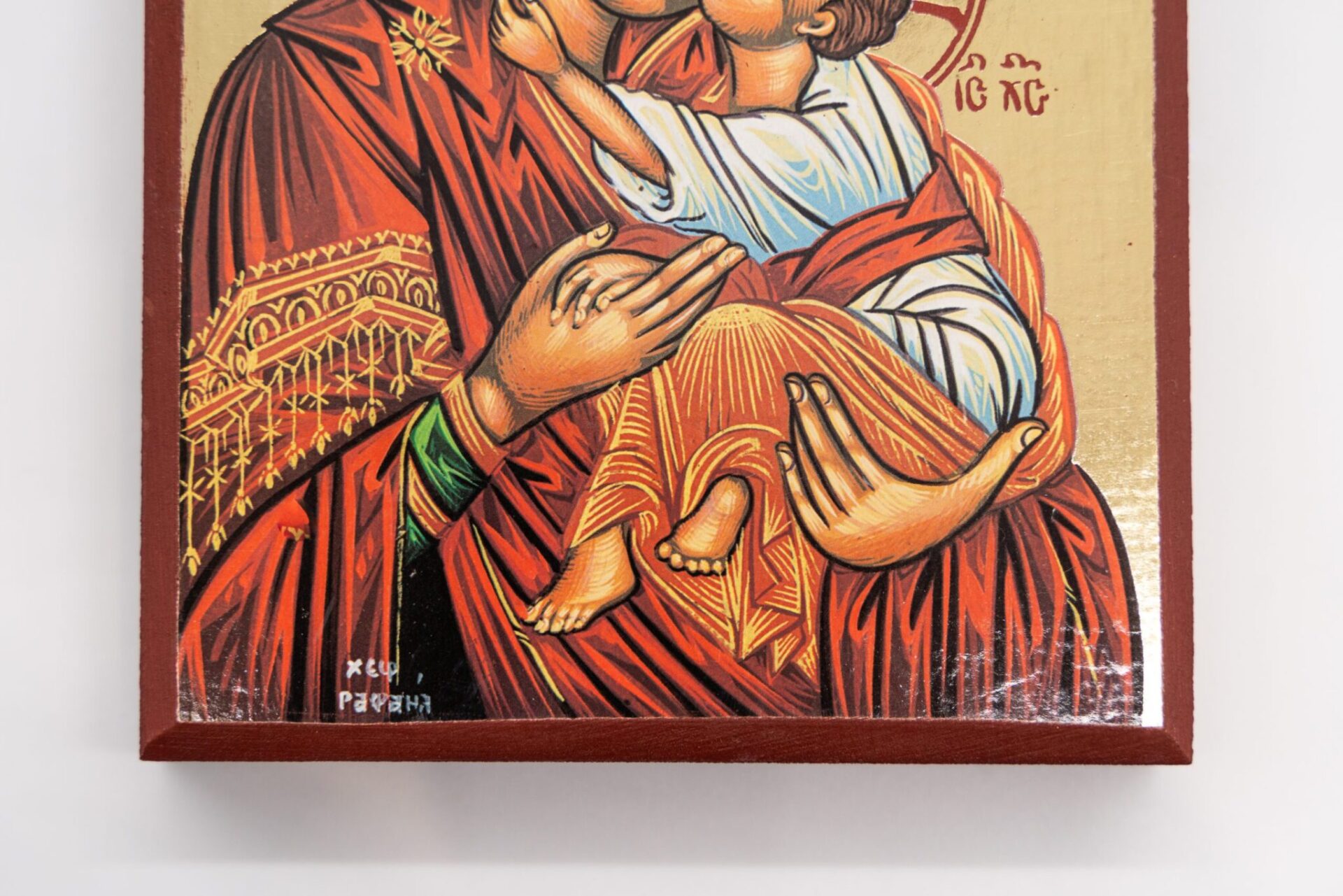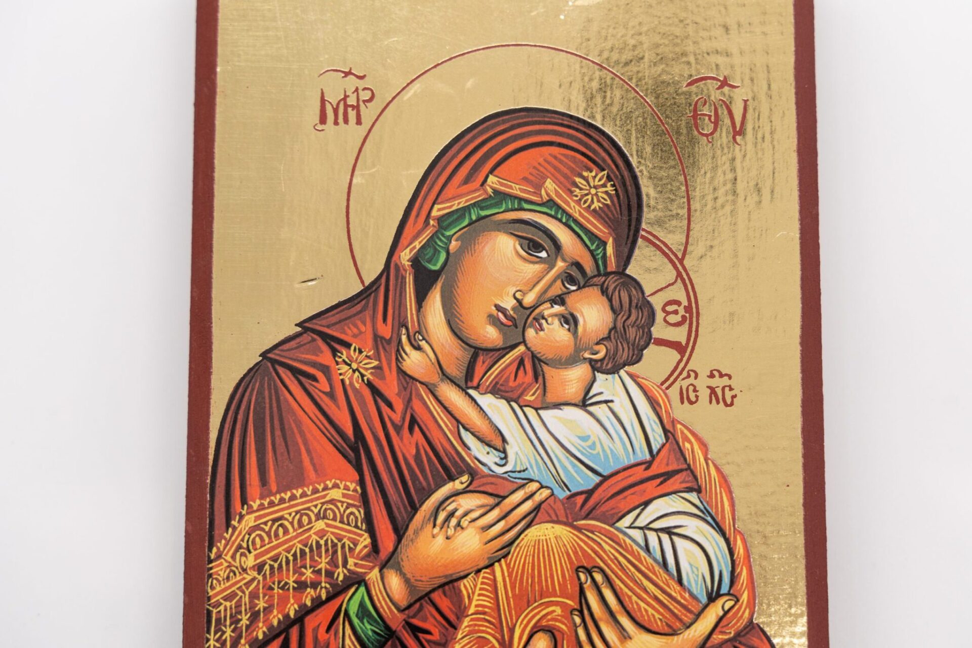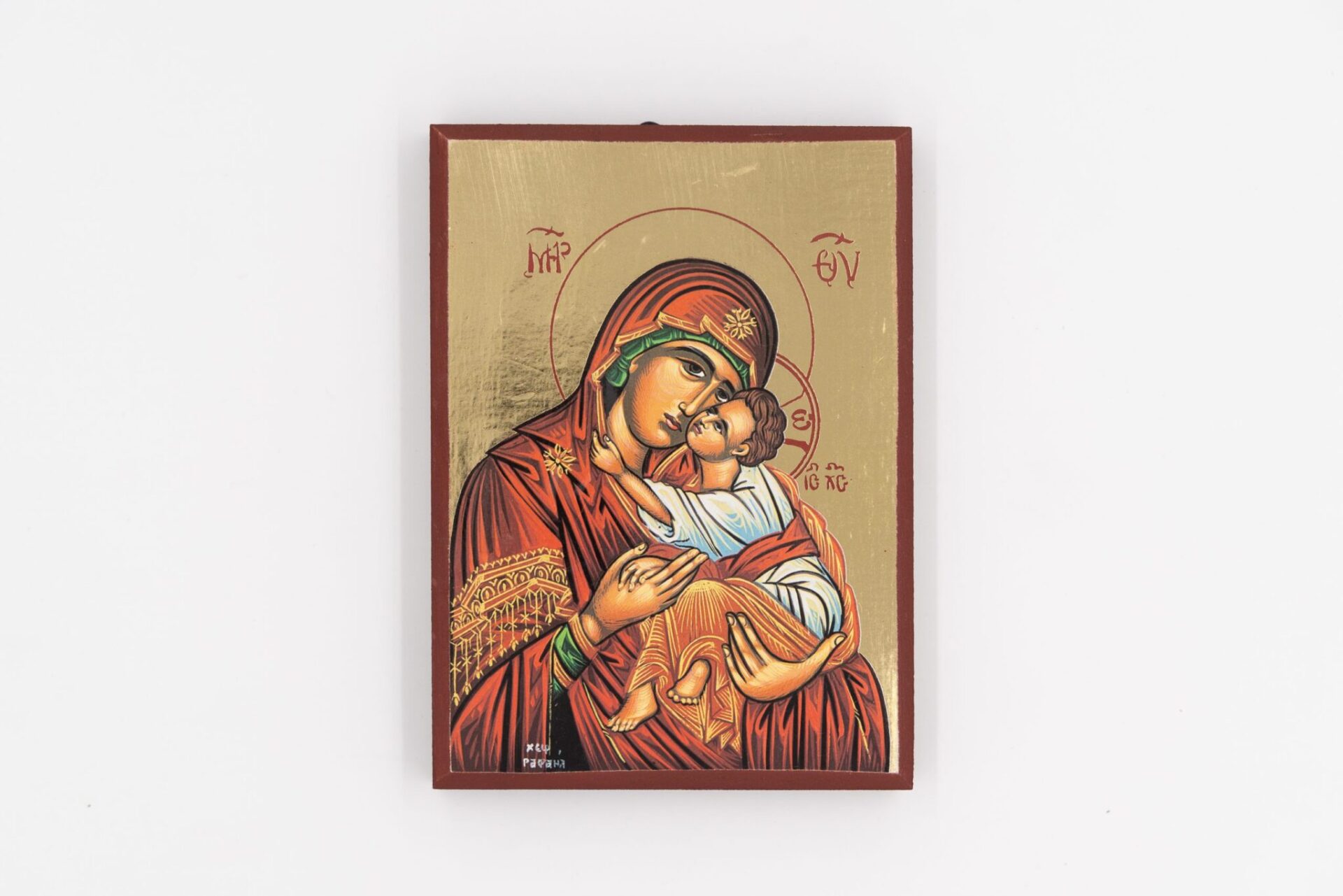 Icona , rifinita a mano, raffigurante la Madonna della Tenerezza su legno.