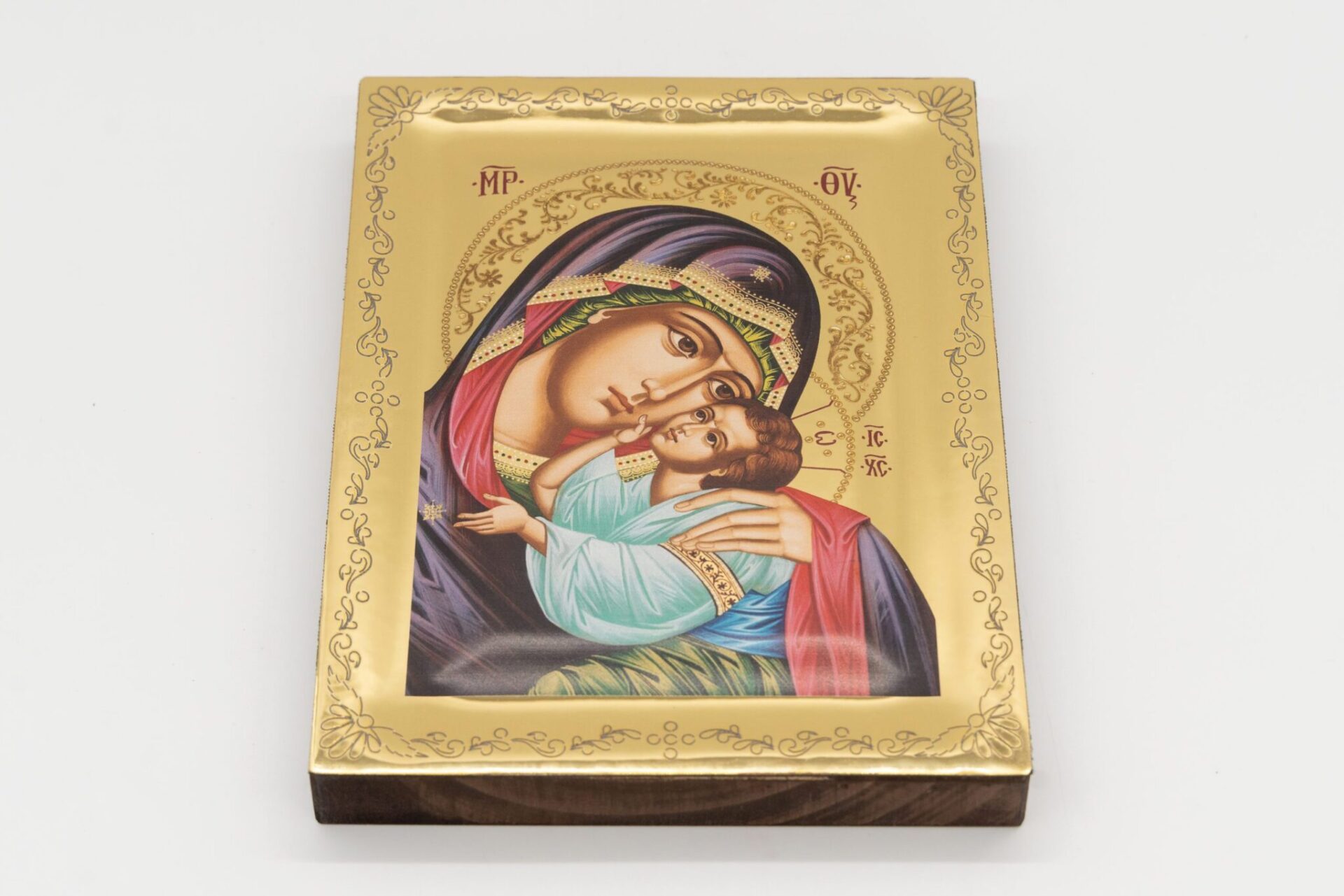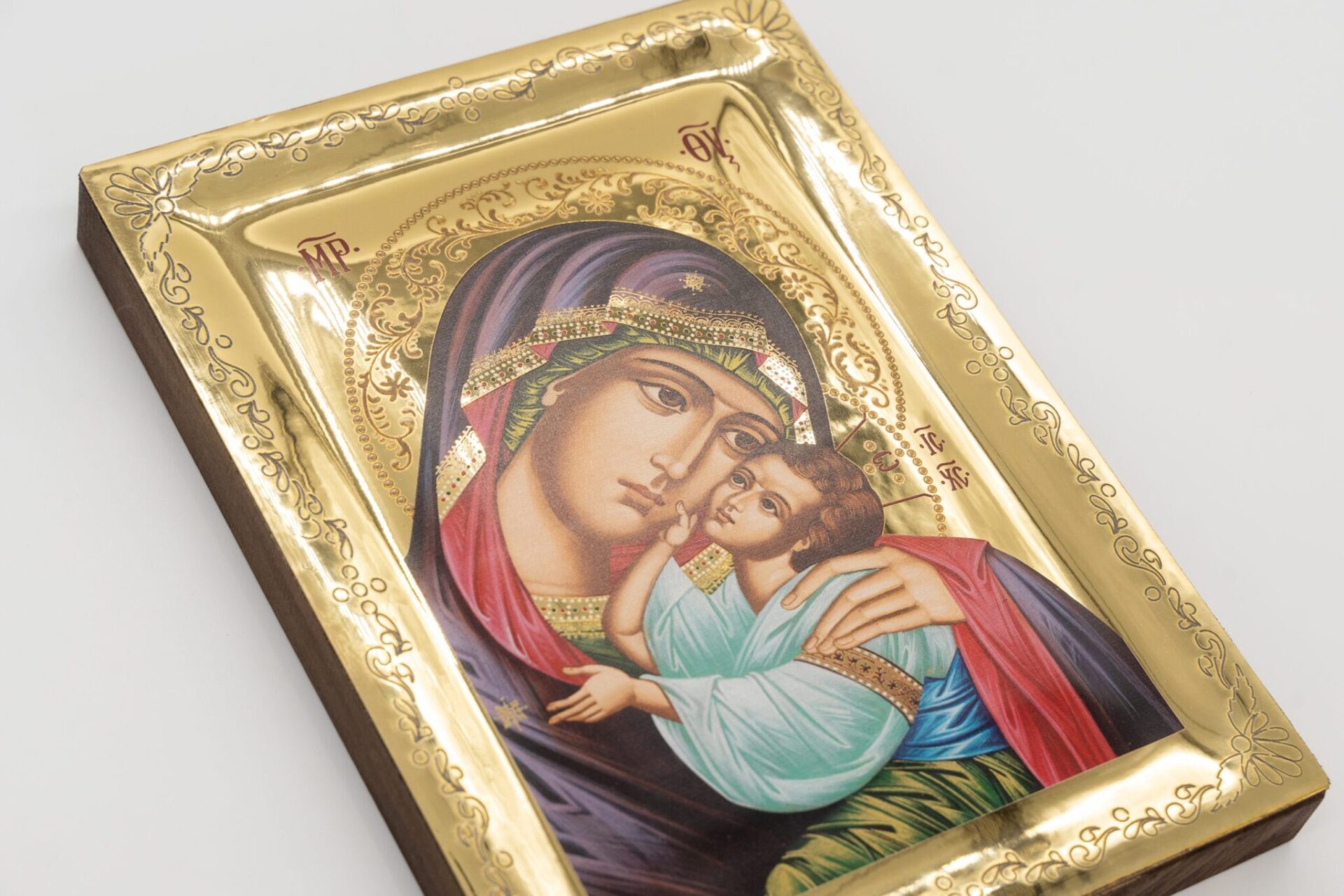 Questa icona è una litografia su legno e rifinita con foglia d’oro a specchio, mentre le aureole, gli scritti e le bordure sono realizzati a mano.