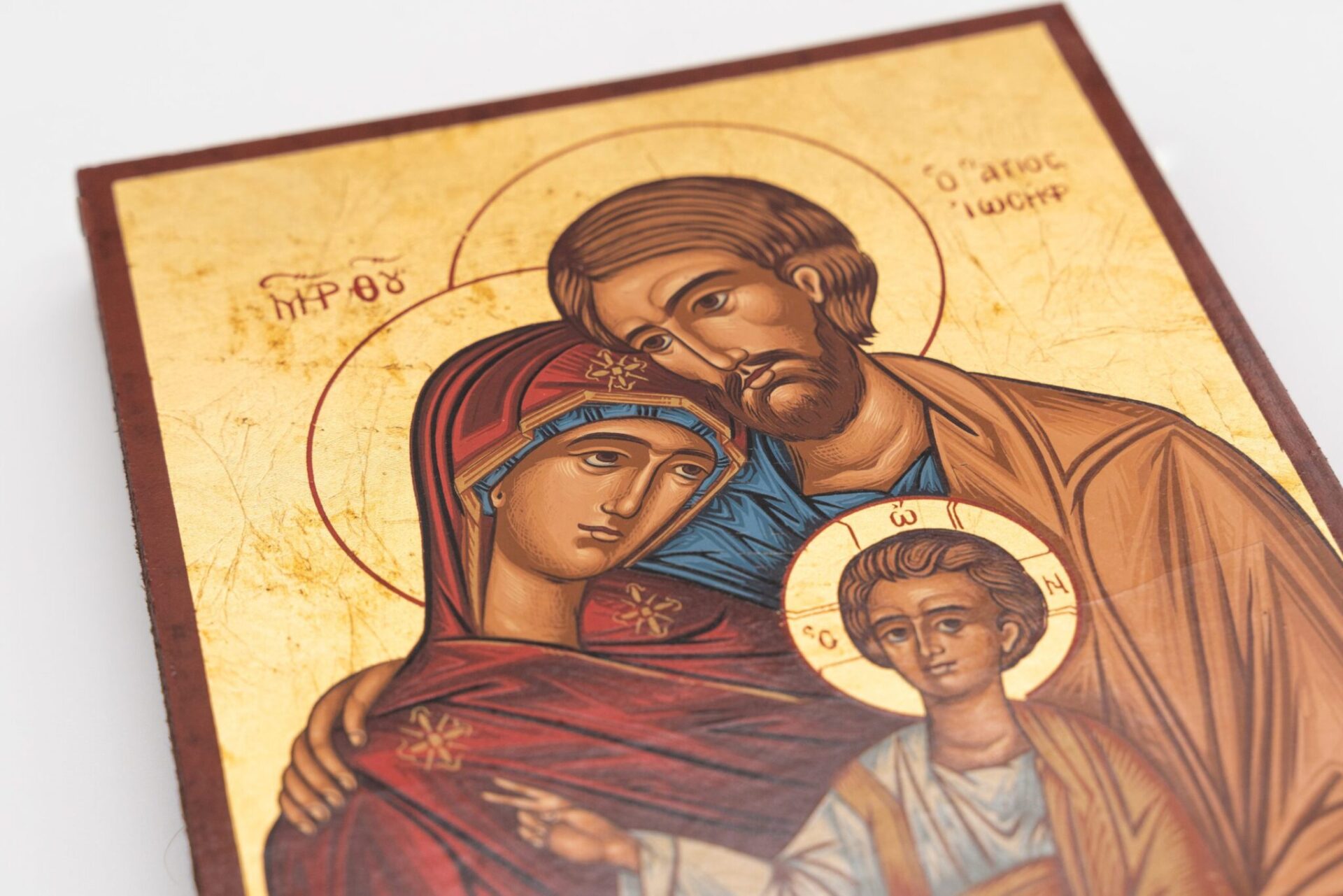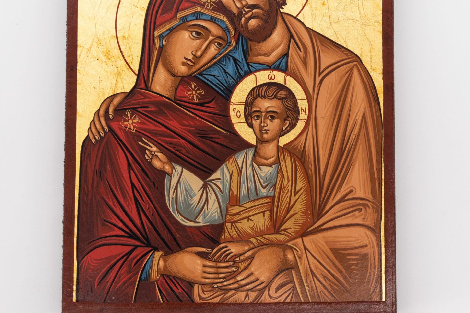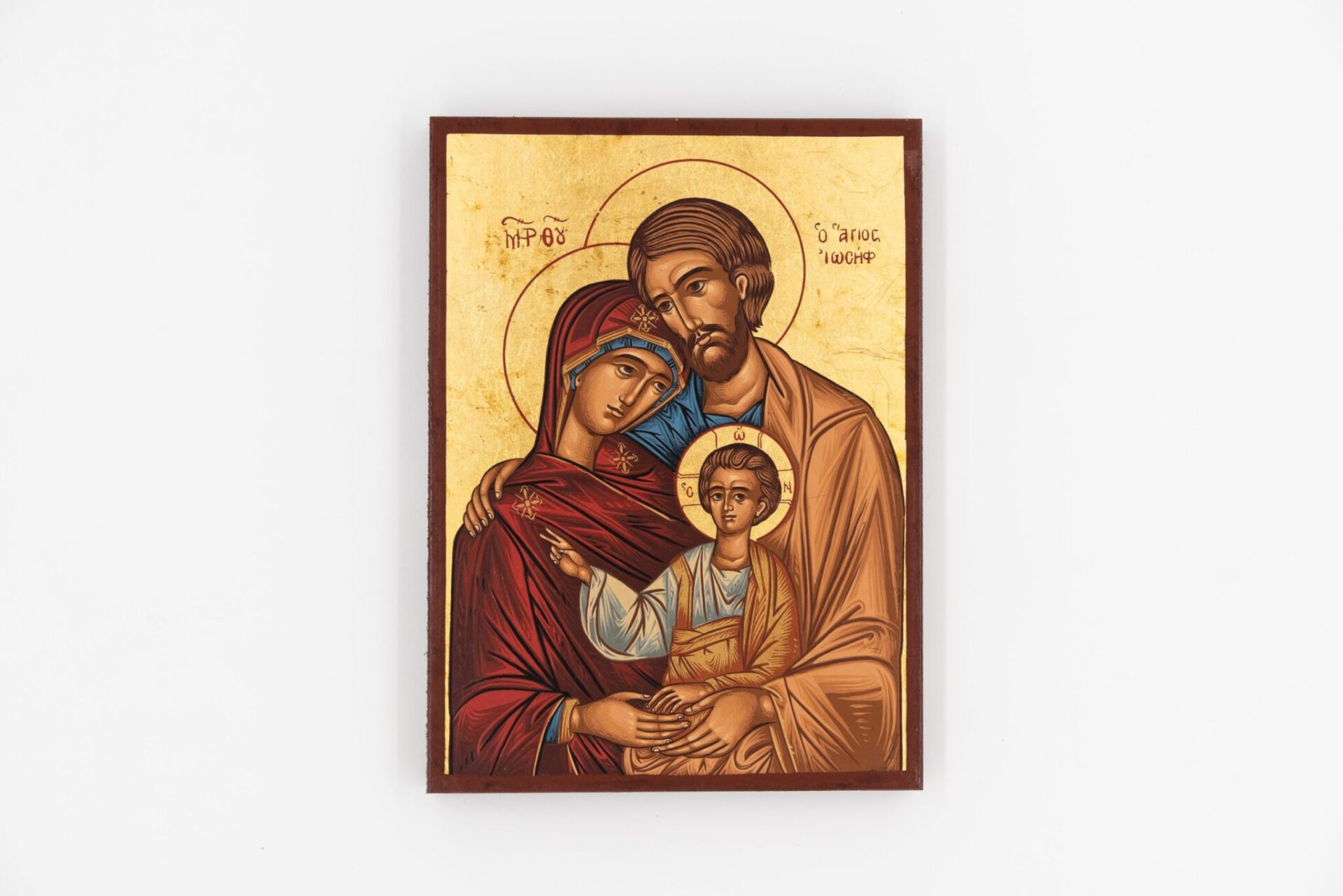 Icona, rifinita a mano su legno, raffigurante la Sacra famiglia.