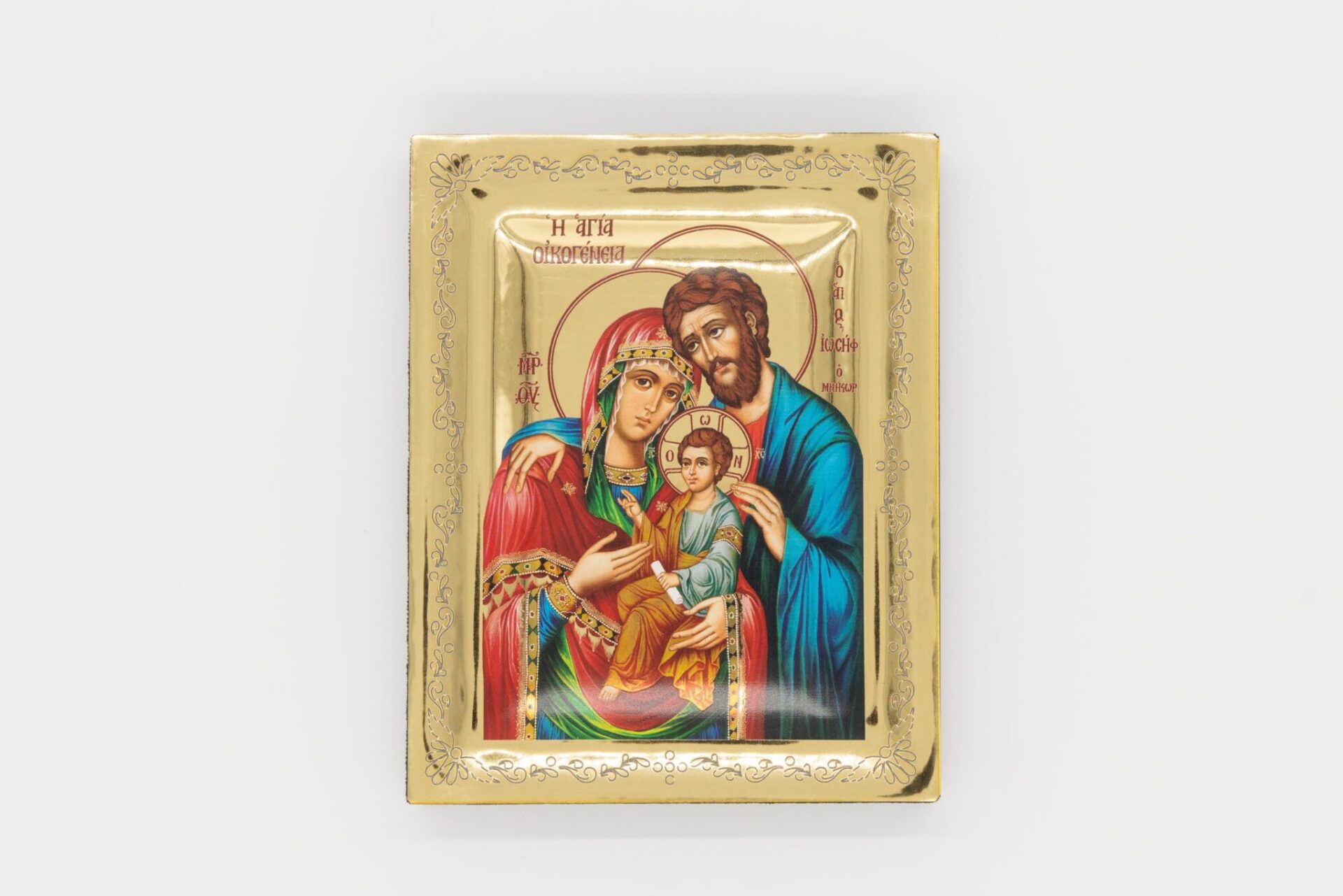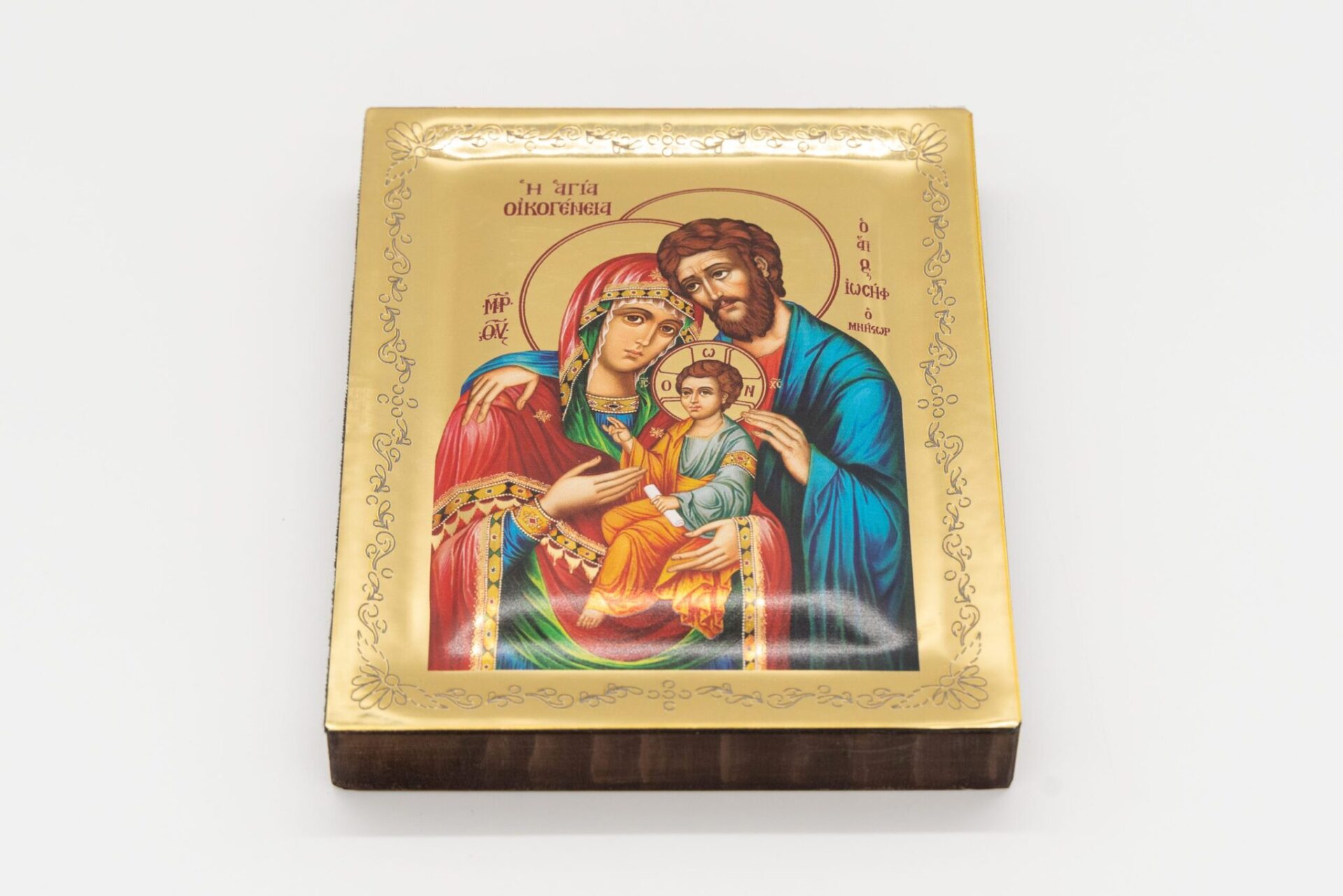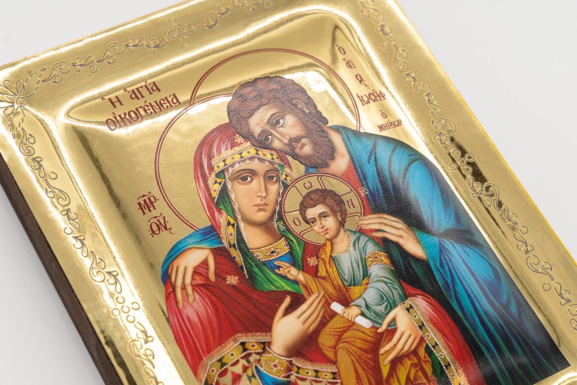 L’icona raffigura la Sacra Famiglia, composta da tre figure centrali: Maria, Giuseppe e il Bambino Gesù. Maria è rappresentata con un manto rosso e un copricapo verde e dorato, mentre Giuseppe indossa un mantello blu. Il Bambino Gesù è al centro, vestito con un abito giallo e verde. Lo sfondo dell’icona è dorato a specchio e ci sono iscrizioni in greco intorno alle figure, tra cui:
