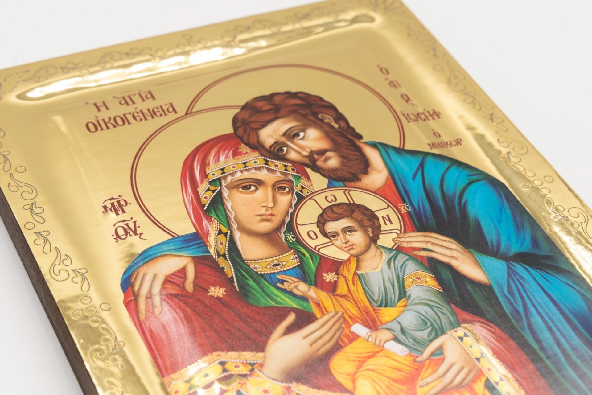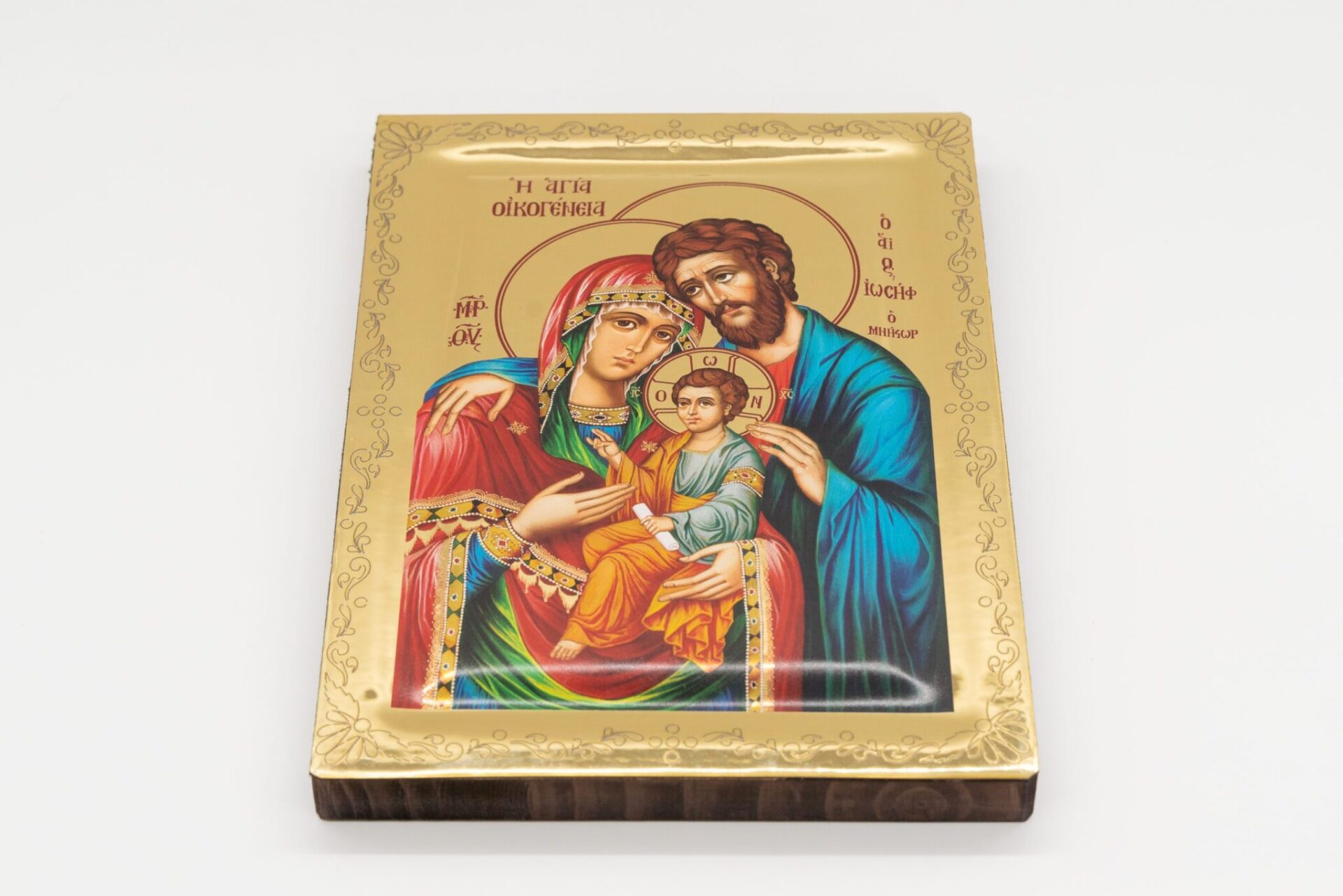 L’icona raffigura la Sacra Famiglia, composta da tre figure centrali: Maria, Giuseppe e il Bambino Gesù. Maria è rappresentata con un manto rosso e un copricapo verde e dorato, mentre Giuseppe indossa un mantello blu. Il Bambino Gesù è al centro, vestito con un abito giallo e verde. Lo sfondo dell’icona è dorato a specchio e ci sono iscrizioni in greco intorno alle figure, tra cui: