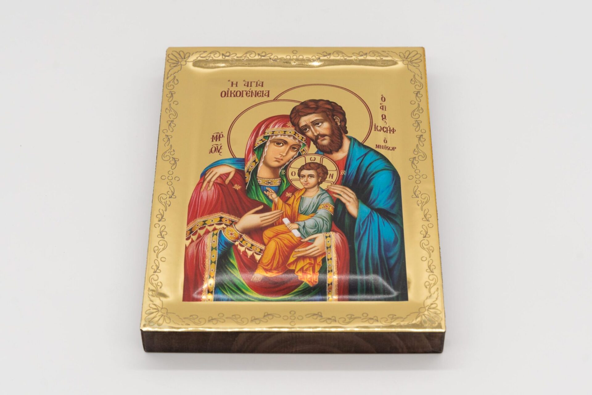 Icona rifinita a mano su legno raffigurante la Sacra Famiglia.