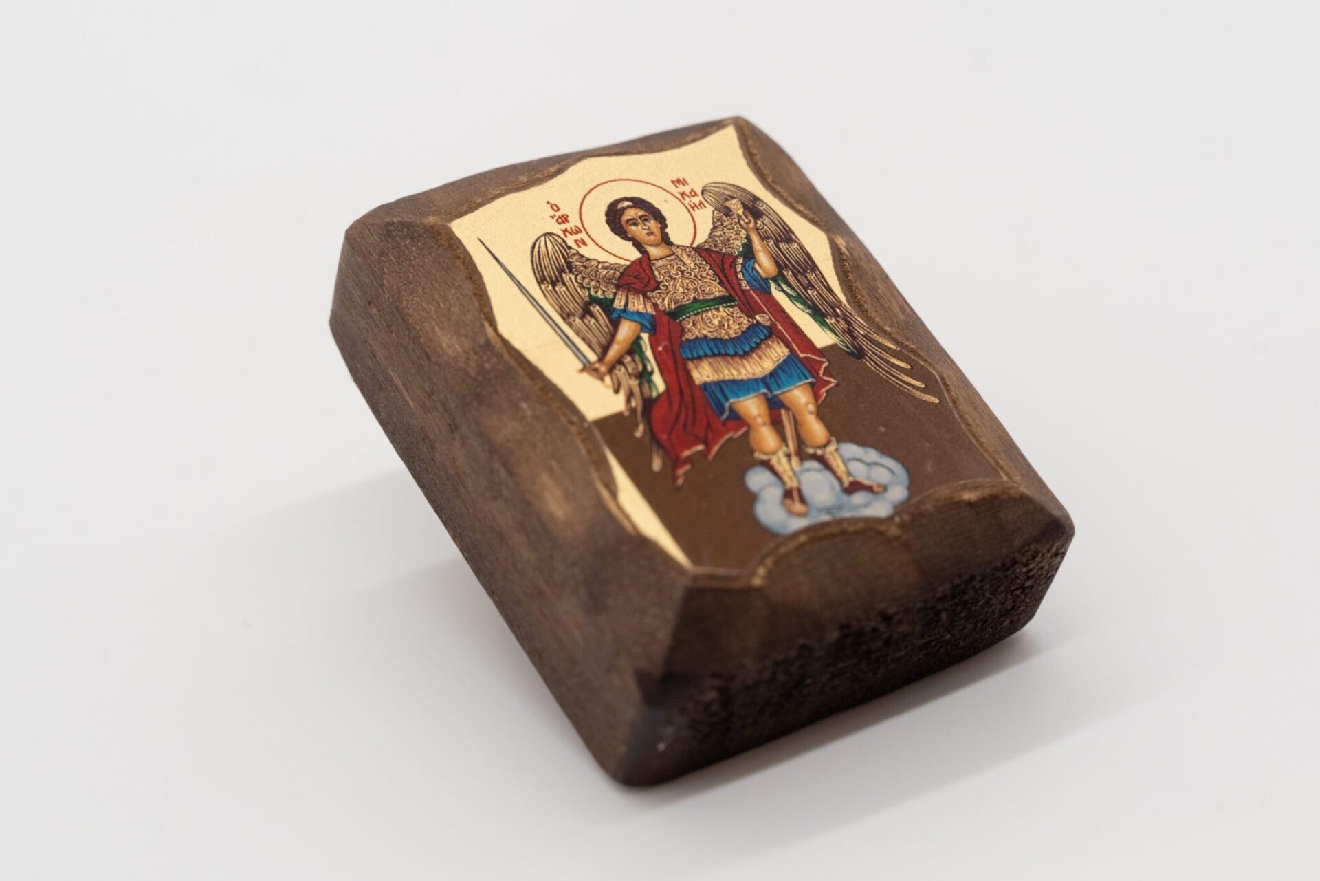 Piccola icona greca realizzata in foglia d’oro su legno rappresentante San Michele Arcangelo.