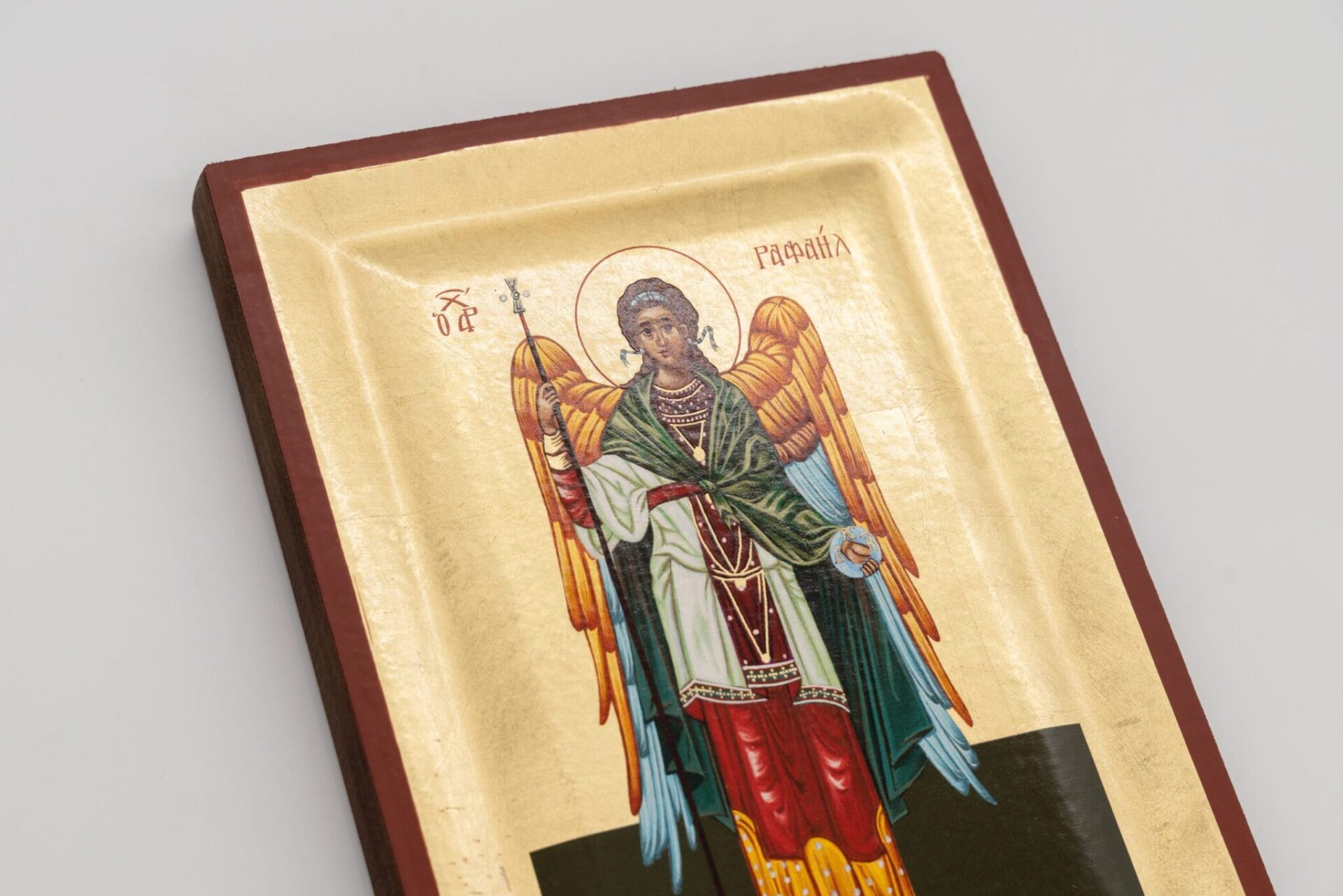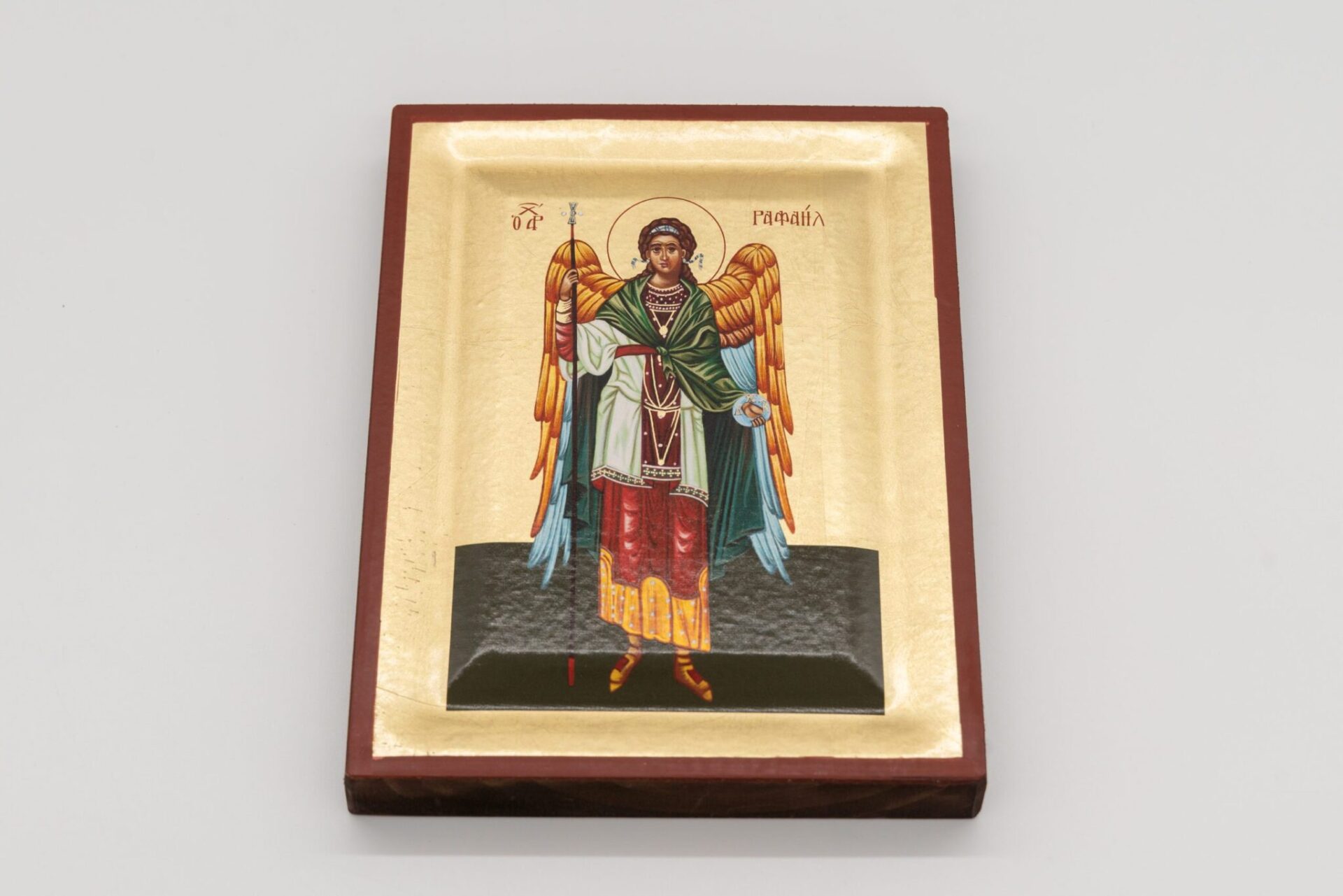 Icona rifinita a mano su legno raffigurante San Raffaele.