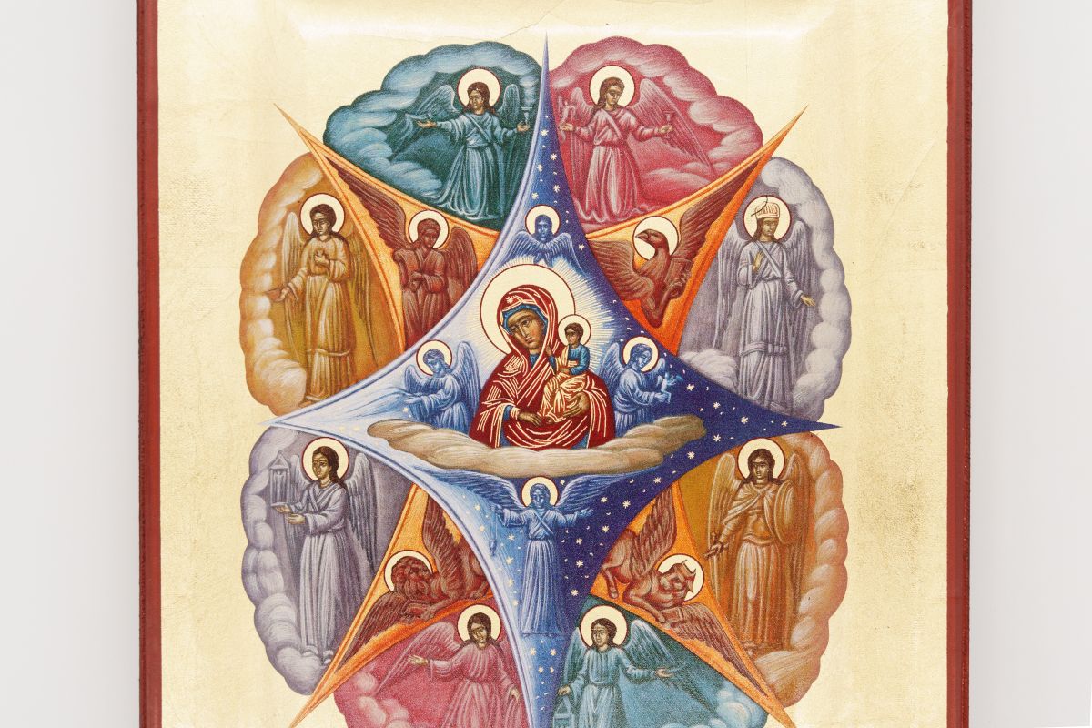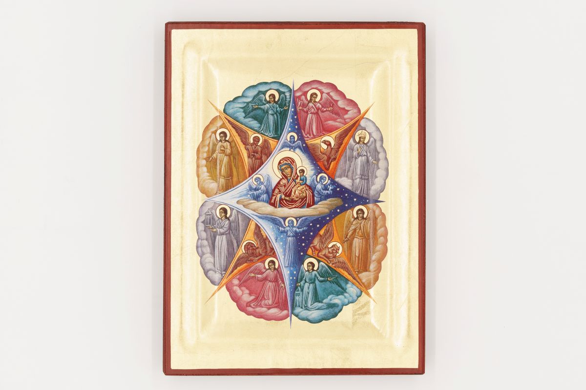 L’immagine mostra un’icona religiosa raffigurante la Madonna con il Bambino al centro, circondata da figure angeliche in diverse pose e colori. L’icona è incorniciata da un bordo dorato e ha un aspetto tradizionale e sacro.