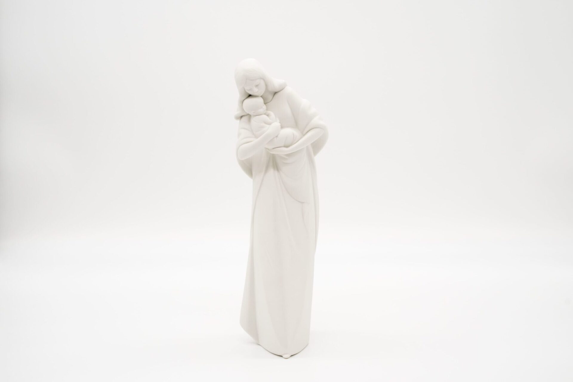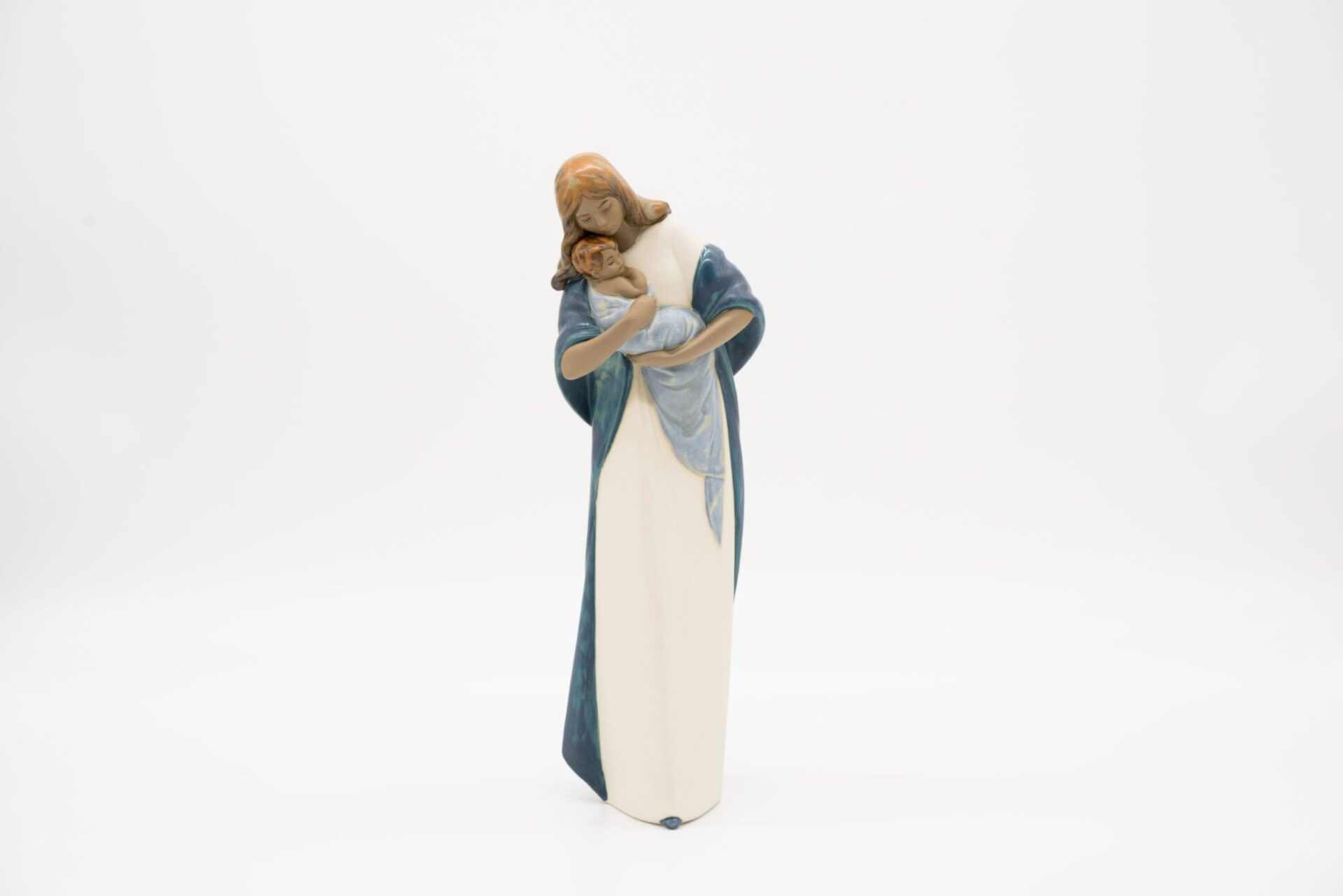 La figura centrale è la Vergine Maria, rappresentata con un’aureola dorata intricatamente decorata. Lei tiene in braccio il Bambino Gesù, anche lui con un’aureola dorata.