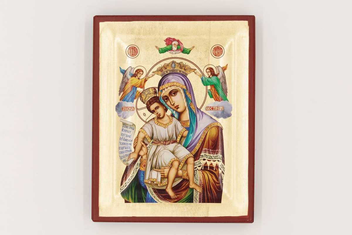 Lo sfondo dell’icona è dorato, rappresentando la luce divina e l’eternità.