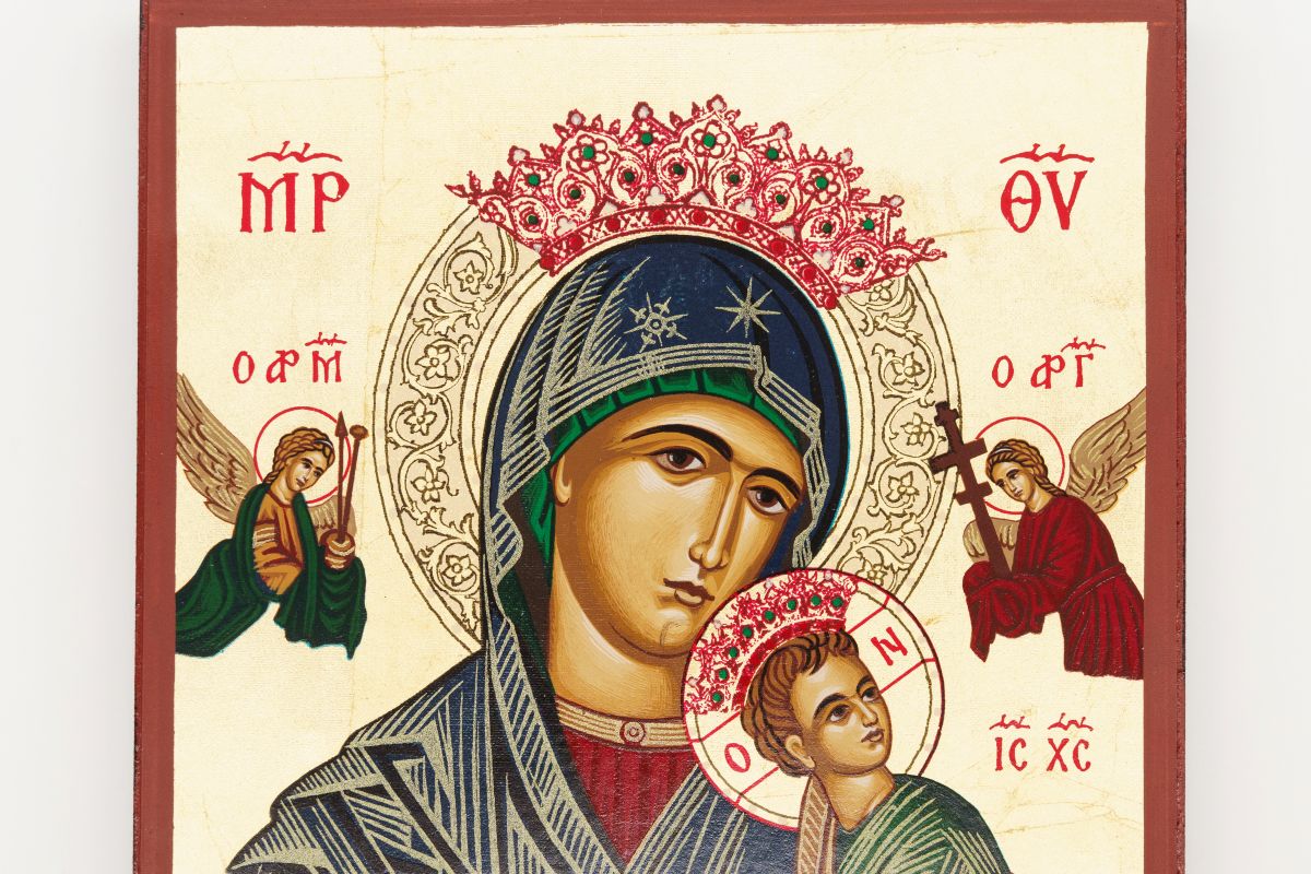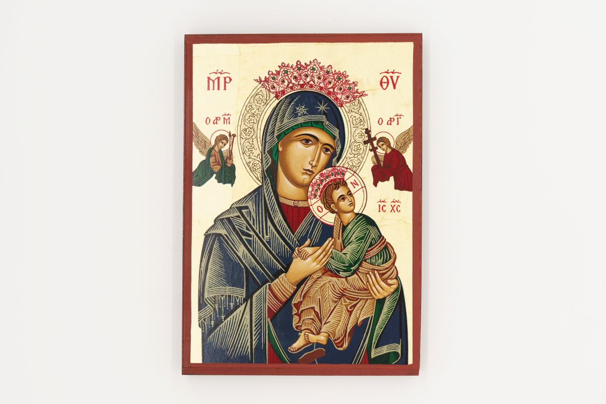 L’immagine mostra un’icona della Madonna del Perpetuo Soccorso, specificamente un’icona cristiana ortodossa orientale.
