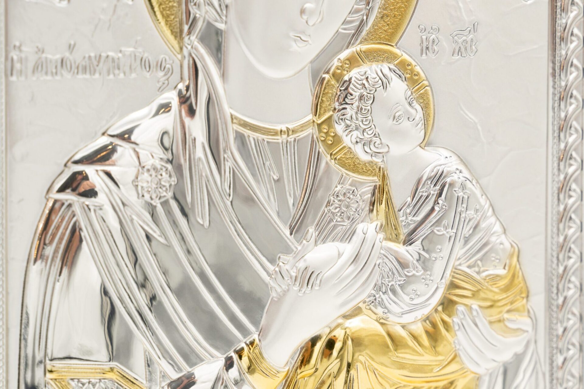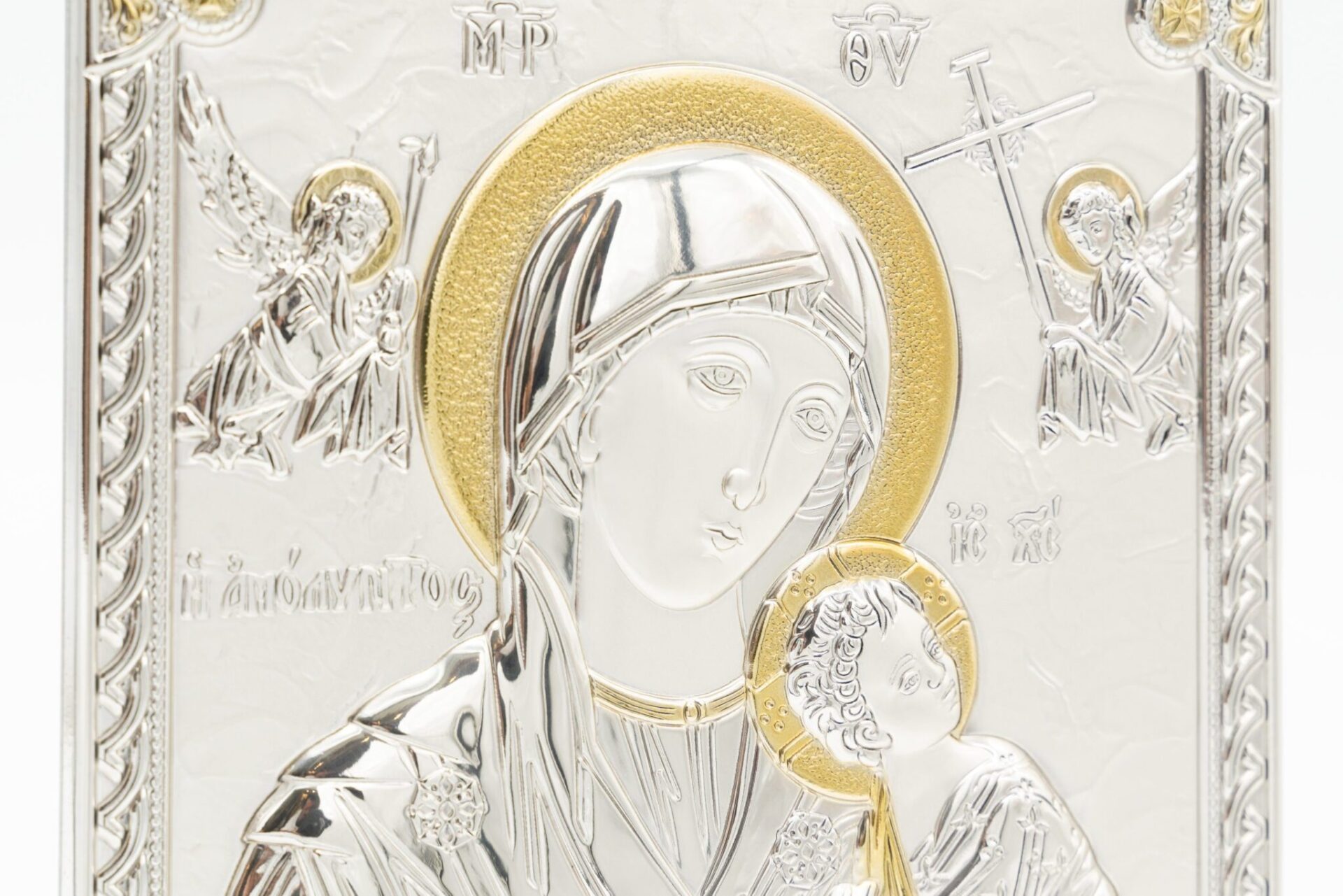 Icona “Madonna del Perpetuo Soccorso” in argento e dettagli dorati.