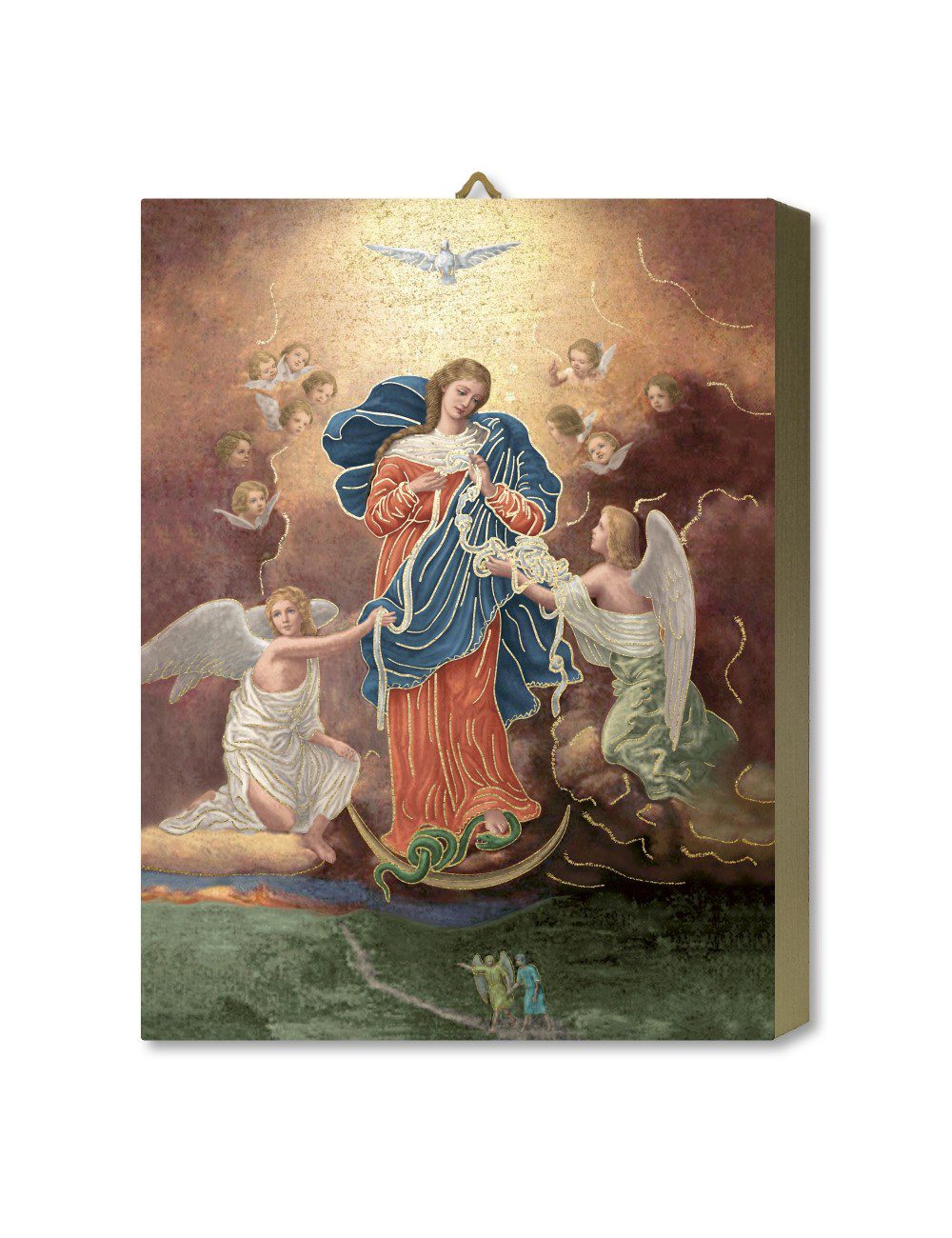 Maria è vestita con una tunica rossa e un manto blu, e si trova in piedi su una luna crescente con un serpente sotto i piedi. È circondata da angeli, e sopra di lei c’è una colomba che simboleggia lo Spirito Santo. Maria tiene in mano un lungo nastro bianco con nodi, che sta sciogliendo con l’aiuto di un angelo alla sua sinistra. Lo sfondo è riempito con una luce dorata e figure cherubiche, creando un’atmosfera celestiale.
