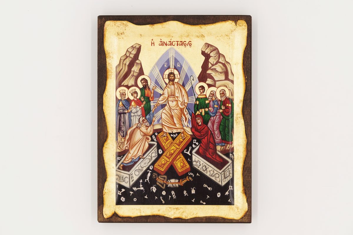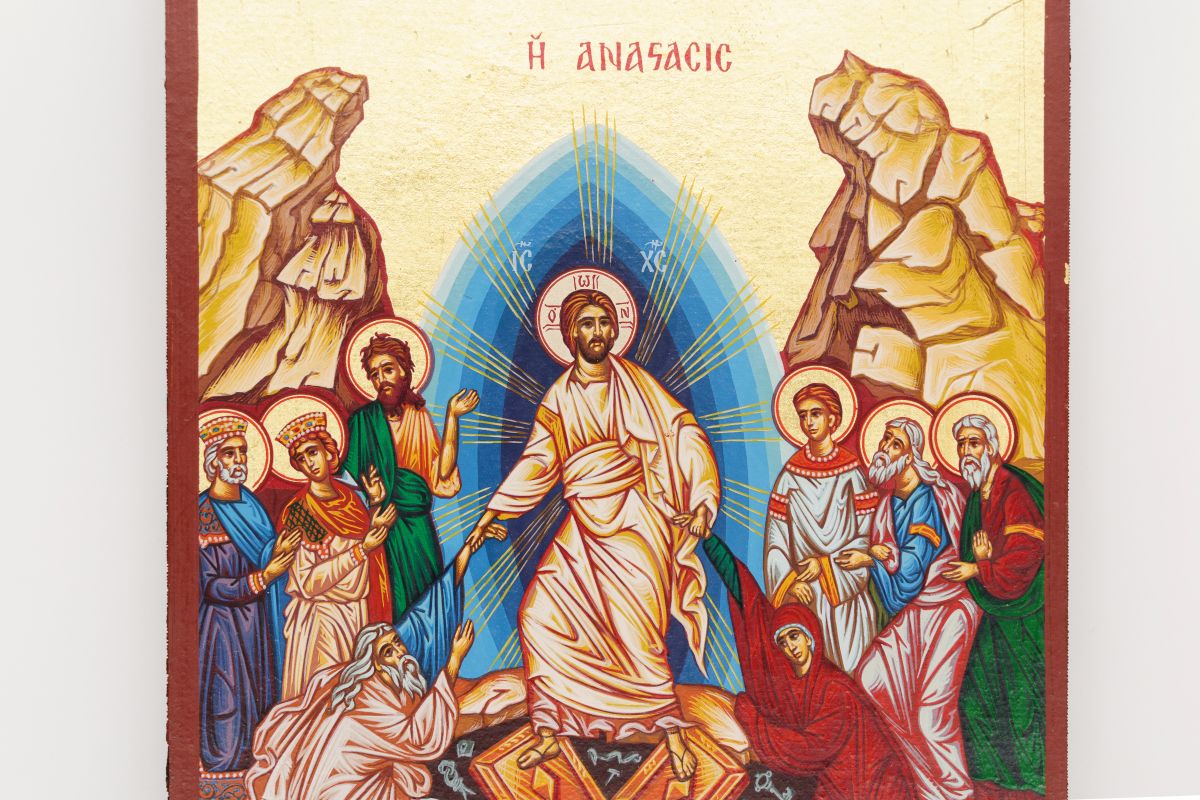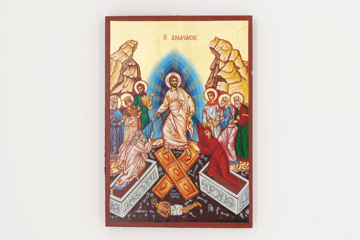L’icona centrale nell’immagine è etichettata “Η ΑΝΑΣΤΑΣΙC,” che si traduce in “La Risurrezione” in italiano. Questa icona rappresenta la risurrezione di Gesù Cristo, con Gesù raffigurato in vesti bianche al centro, circondato da varie figure, tra cui angeli e santi.