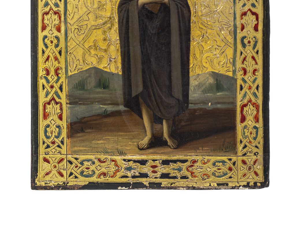La figura centrale è Cristo con un’aureola dorata intorno alla testa. La figura è vestita con un mantello scuro e ha le mani incrociate sul petto. Lo sfondo dell’icona è dorato con intricati motivi decorativi.