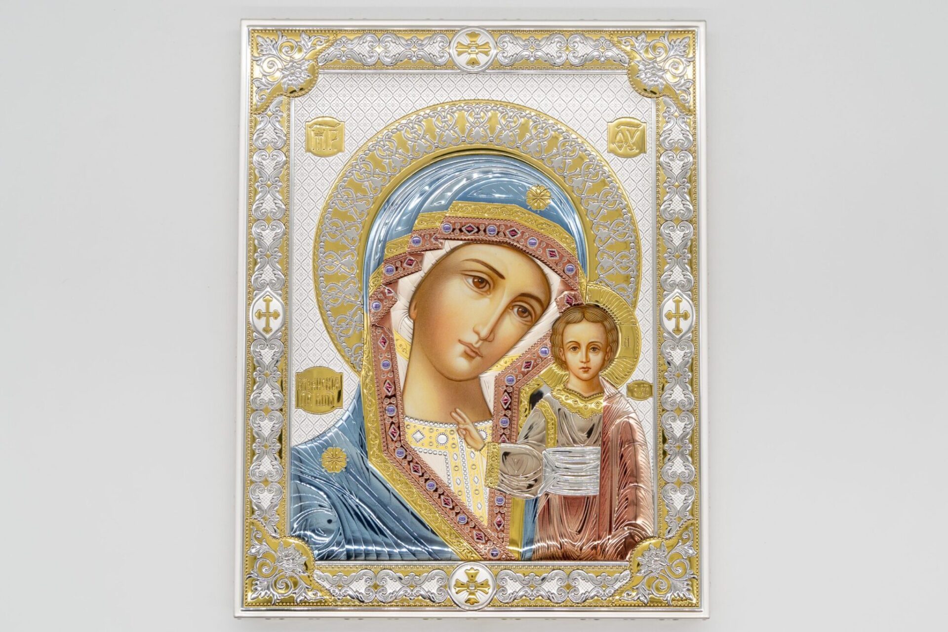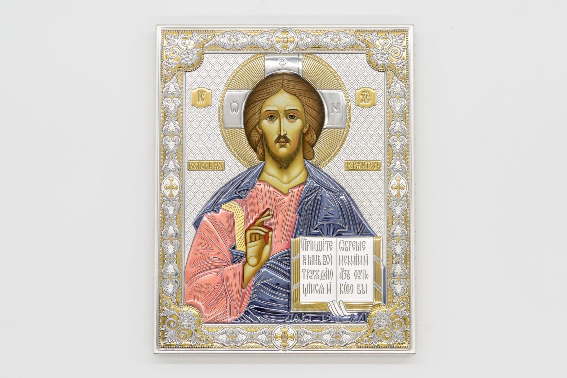 L’icona è decorata con elementi intricati in argento e oro. Le figure centrali sono adornate con aureole, indicando la loro santità.