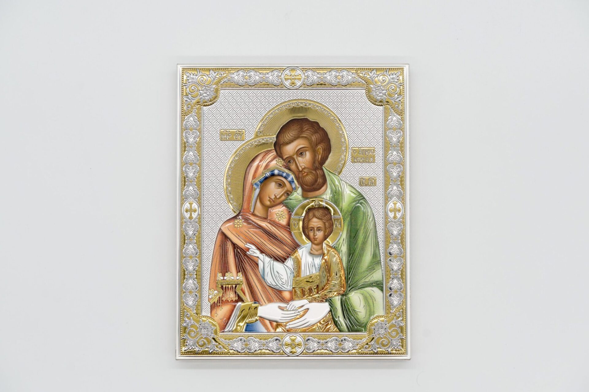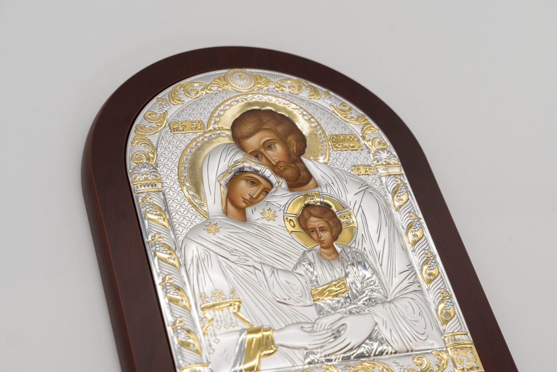 Icona serigrafata sagomata con argento, rappresenta la Sacra Famiglia.