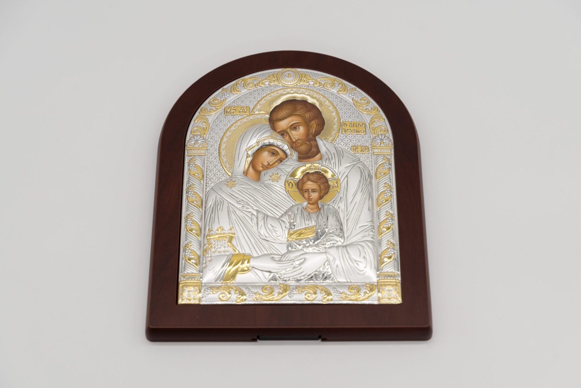 Sull’icona è presente del testo in greco, che include le parole “ΜΡ ΘΥ” (Madre di Dio) e “ΙΩΣΗΦ” (Giuseppe). In basso, il testo recita “ΑΓΙΑ ΟΙΚΟΓΕΝΕΙΑ” (Sacra Famiglia). Questa icona rappresenta un significativo artefatto religioso utilizzato nel culto e nella venerazione cristiana.