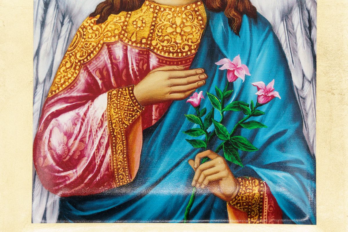 L’Arcangelo Gabriele è raffigurato con ali bianche, un’aureola dorata intricata e indossa una tunica blu con dettagli dorati e un mantello rosso.