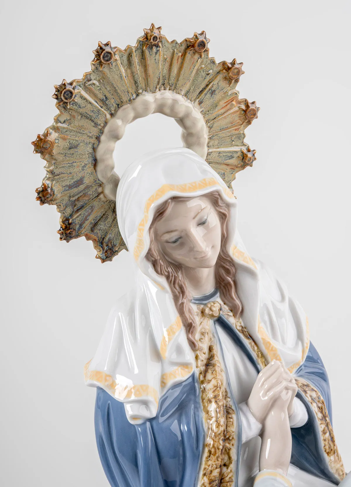 Figura di porcellana scintillio della Vergine della Divina Provvidenza decorata con tocchi di smalti ocra nella tunica e corona.