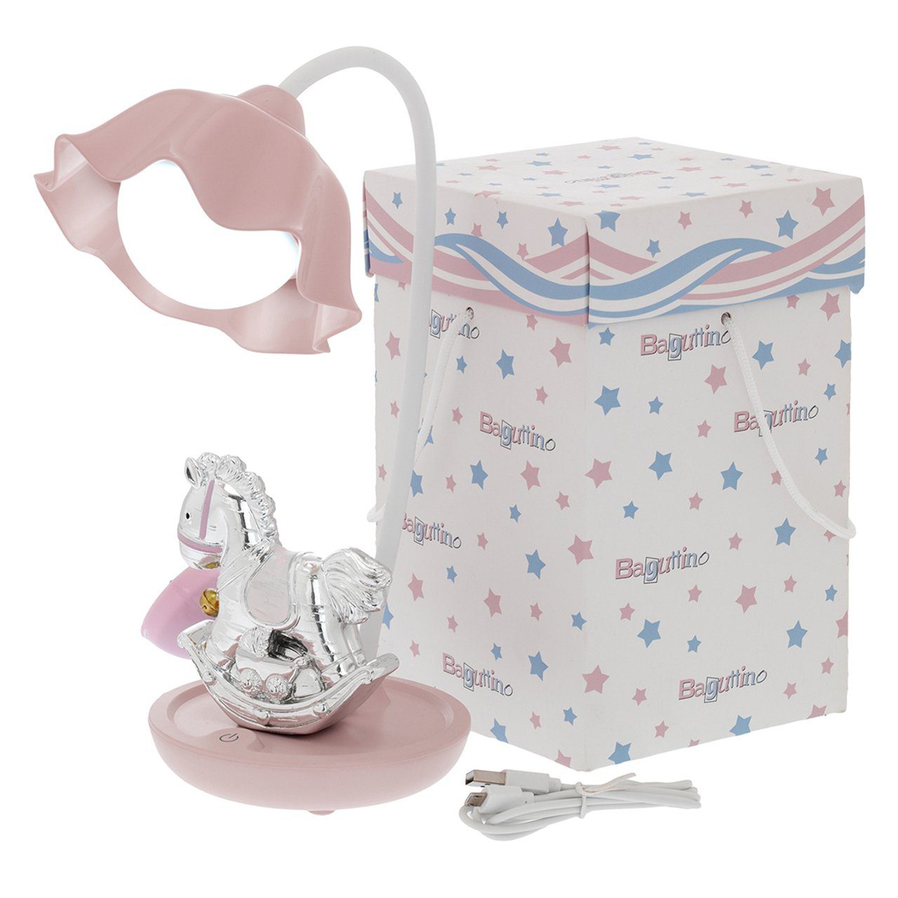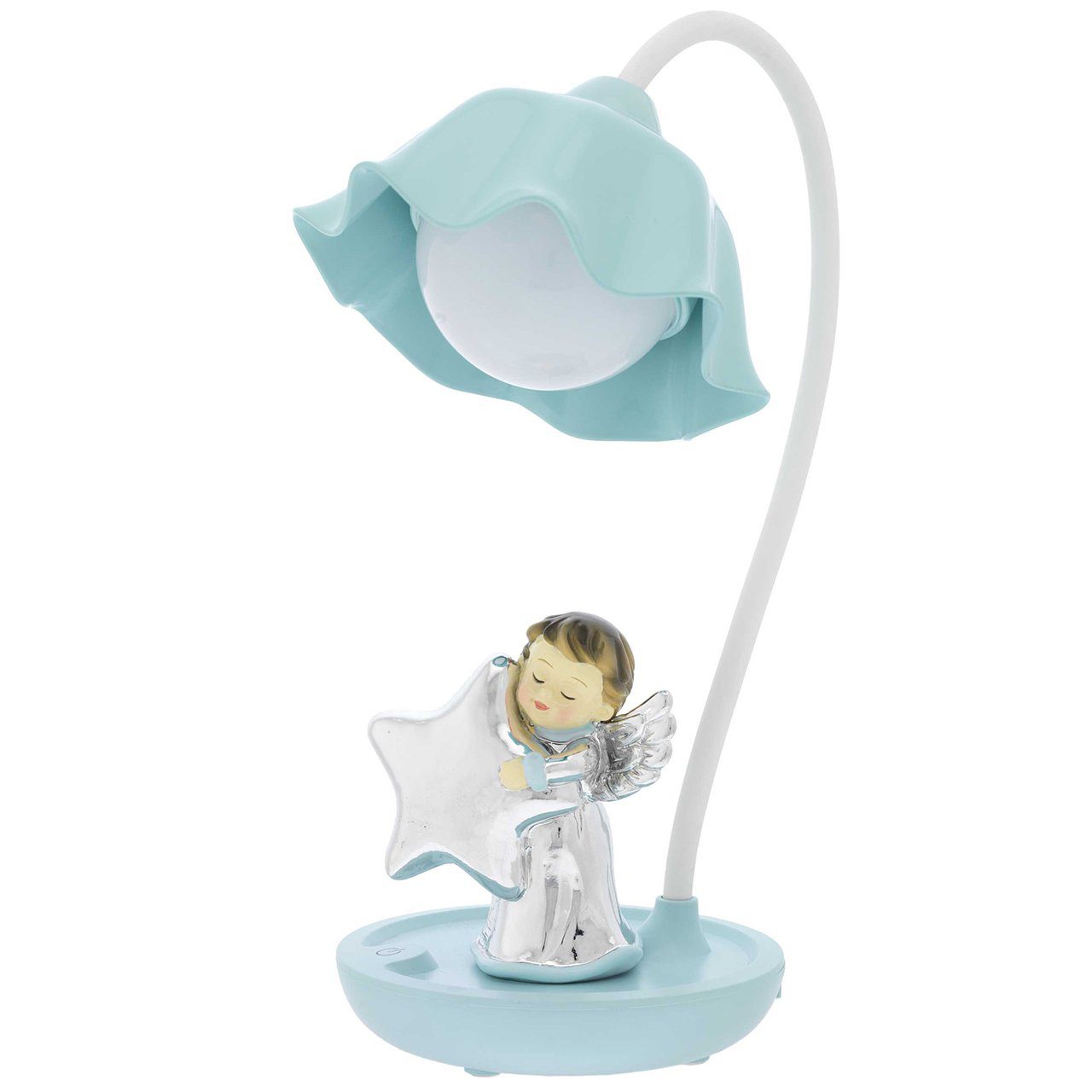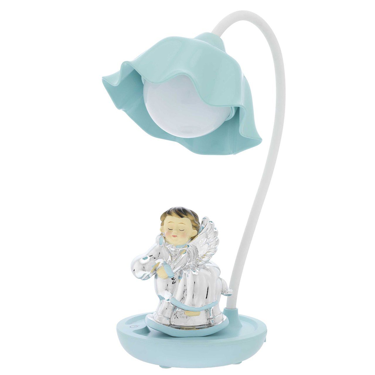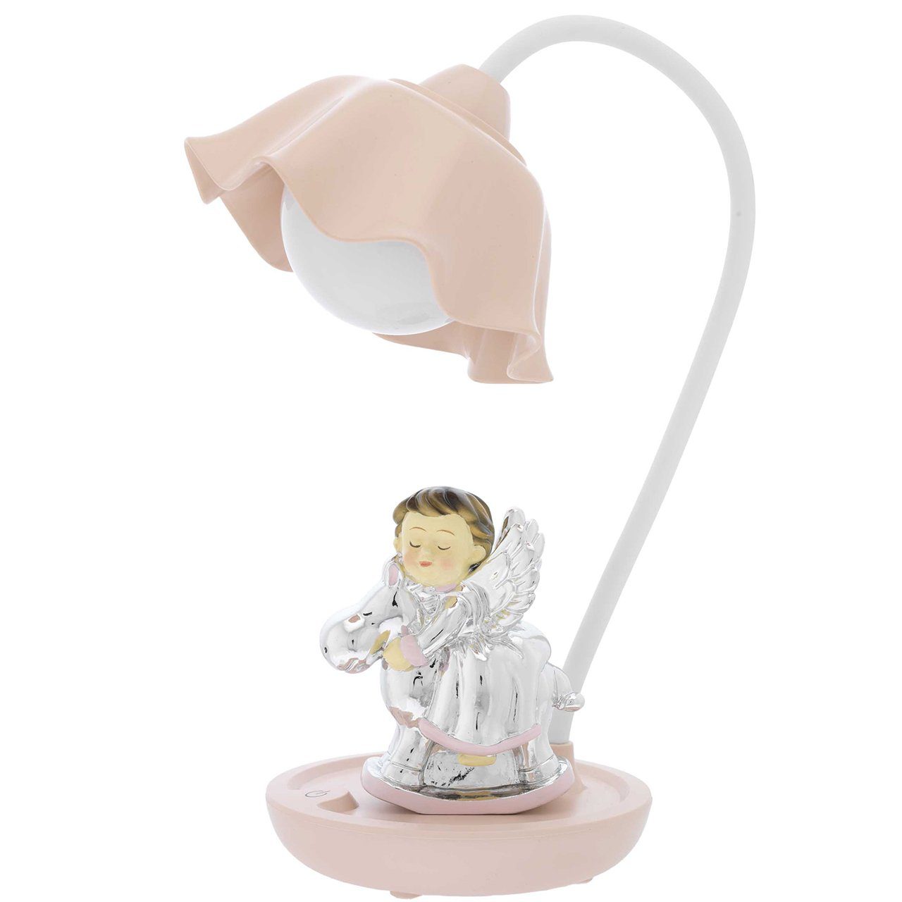 La lampada ha una base azzurra o rosa su cui è posizionata una figura di un cavallo e un angelo in argento.