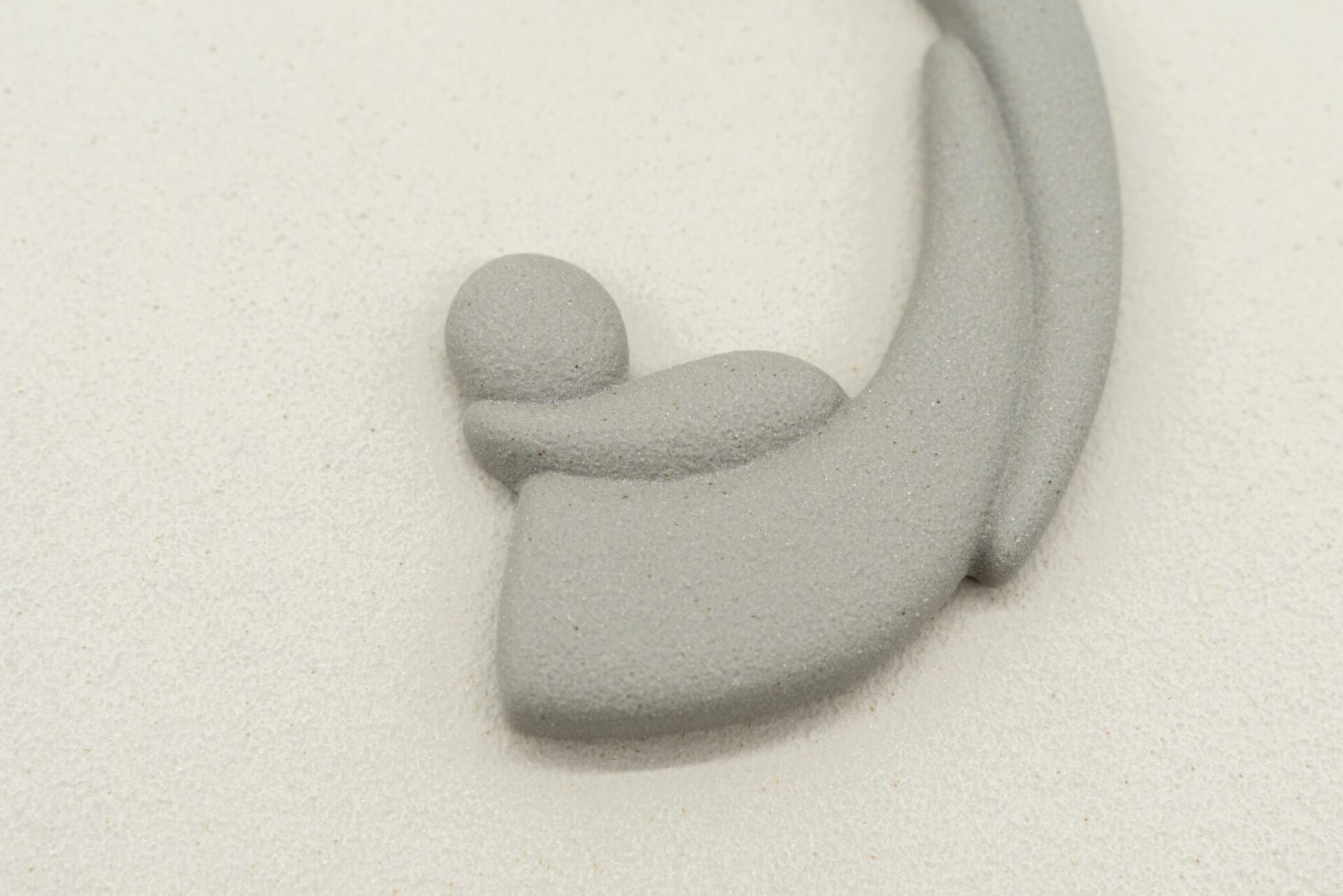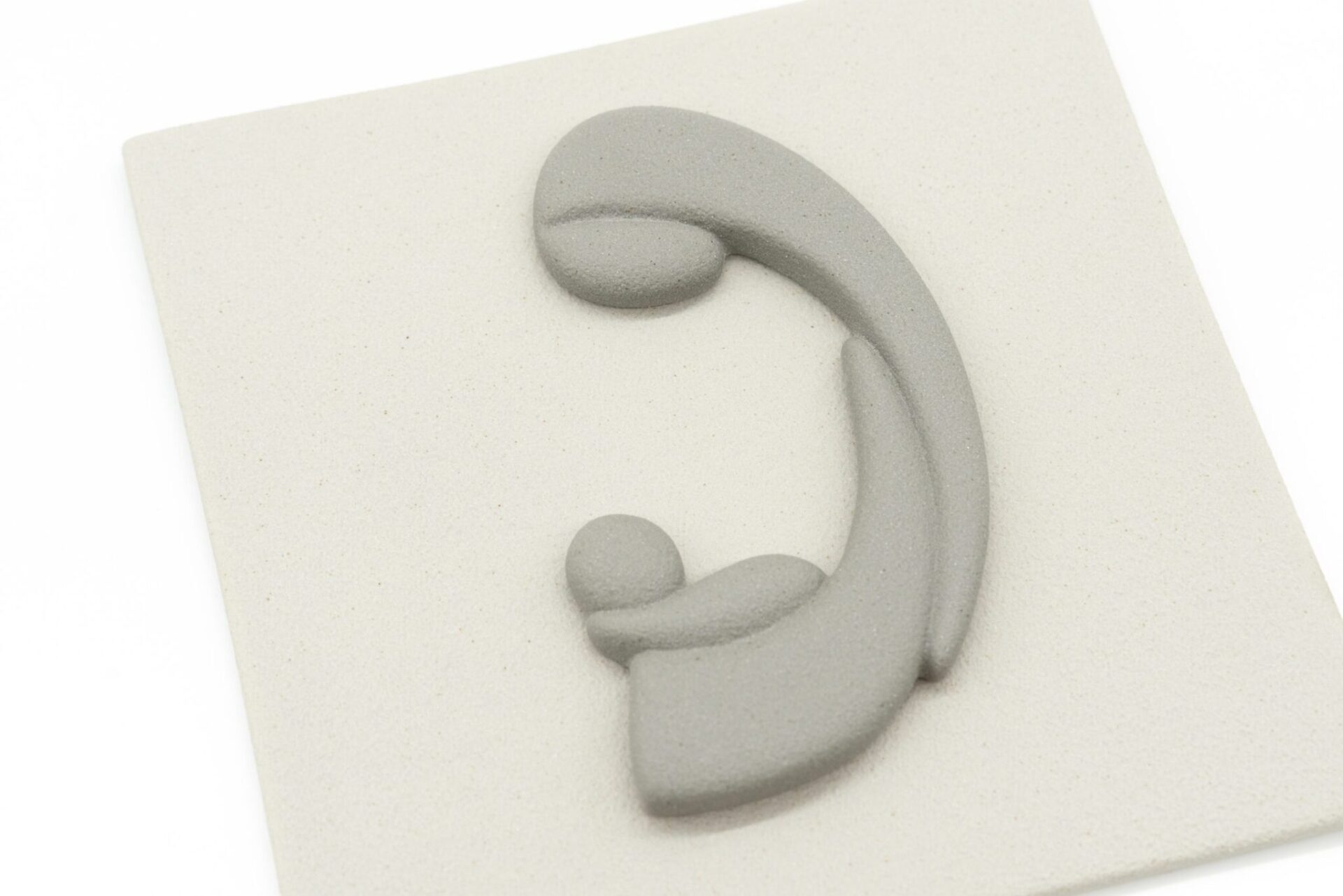 Maria si china per ammirare il Bambino che tiene teneramente tra le braccia, il suo sguardo di dolcezza lo rassicura e protegge. Tra i più apprezzati, questo capezzale moderno racchiude un messaggio comprensibile e puro.