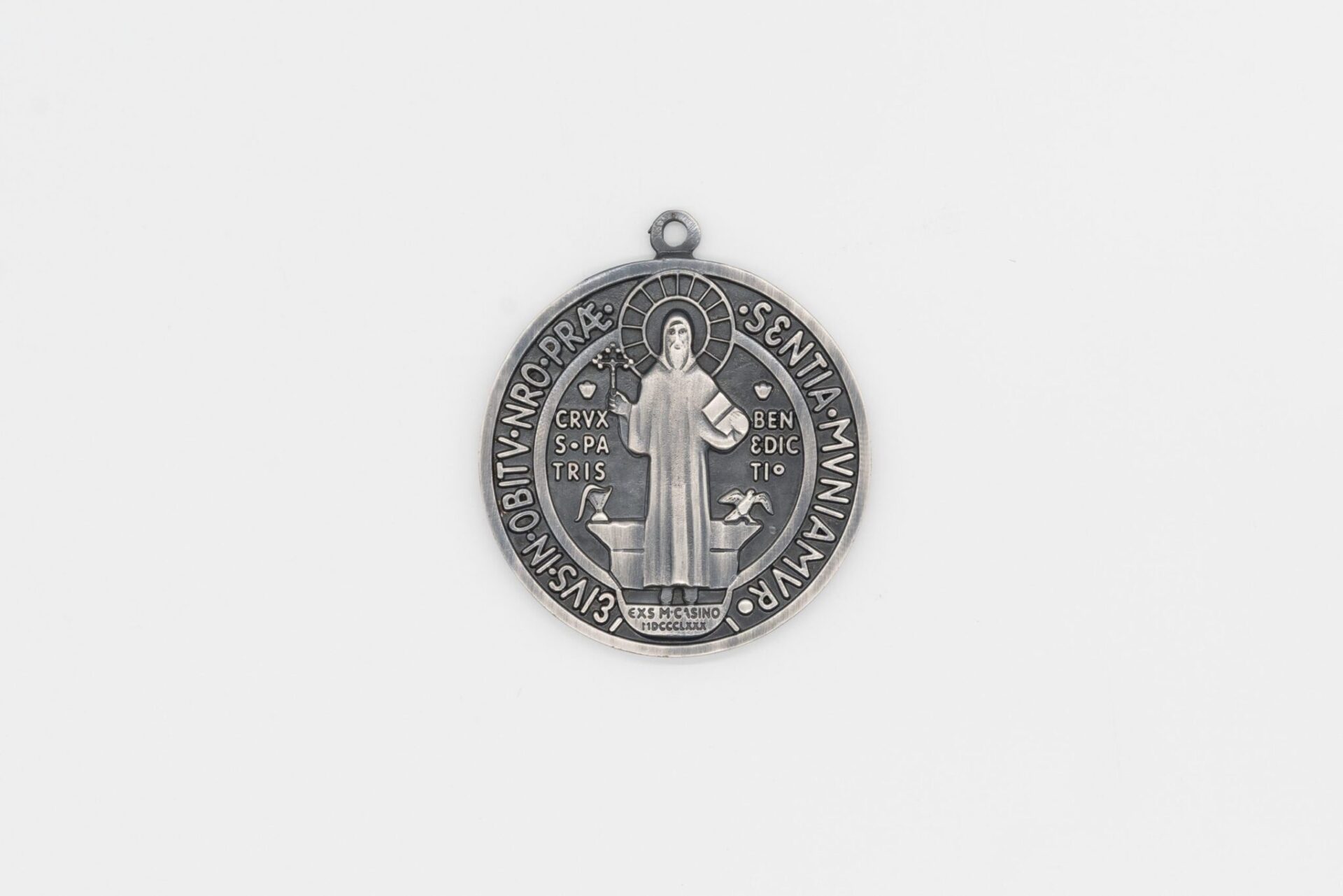 Sulla faccia della medaglia c’è l’immagine di San Benedetto. Nella mano destra tiene la croce, simbolo cristiano di salvezza. Nella mano sinistra c’è la Regola riassunta nelle parole del Prologo “camminare nelle vie di Dio, con il Vangelo come guida”. Sul piedistallo alla destra di San Benedetto c’è una tazza avvelenata, andata in frantumi quando il Santo ha fatto il segno della croce. Sul piedistallo a sinistra c’è un corvo che sta per portare via del pane avvelenato che un monaco invidioso aveva portato a San Benedetto.