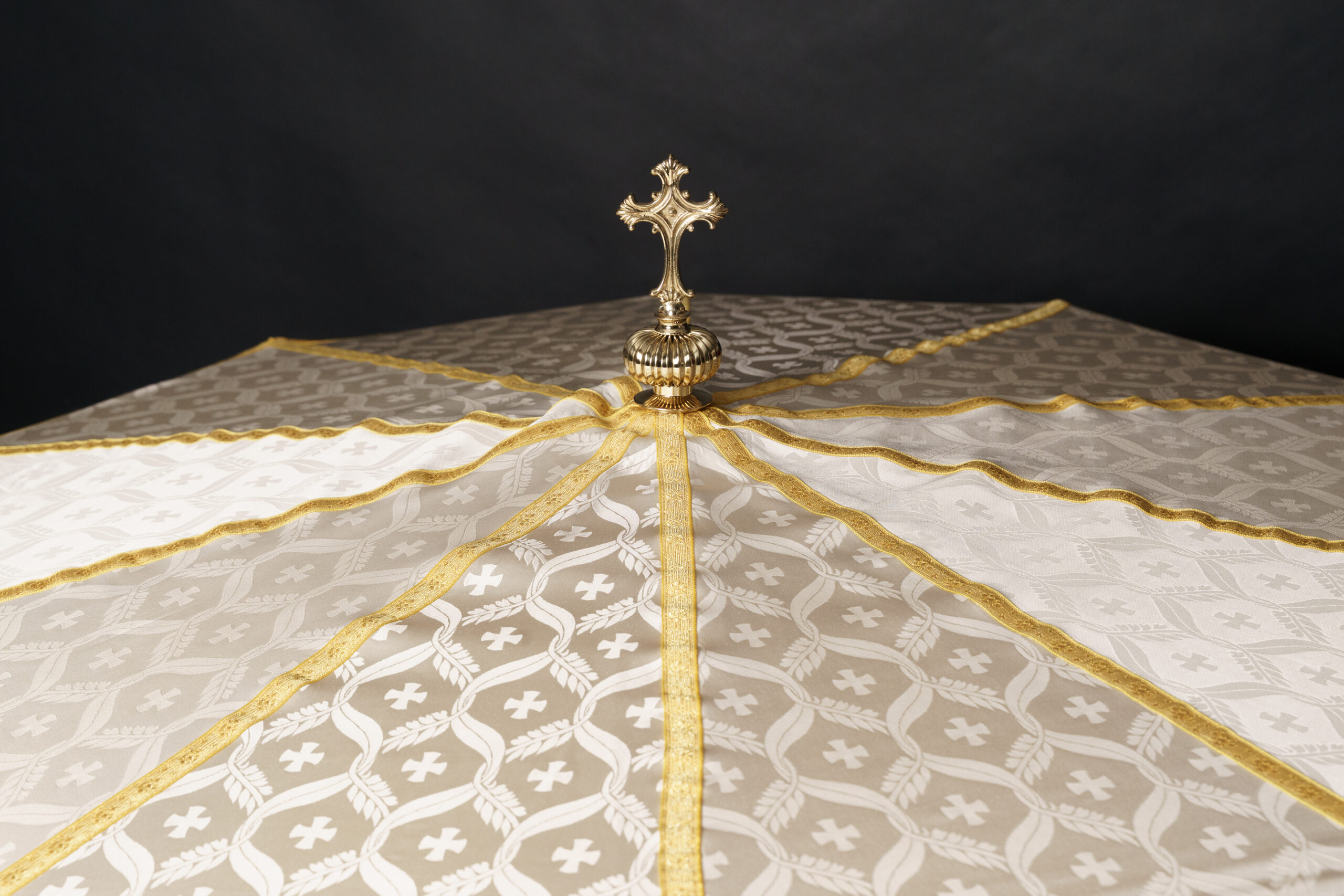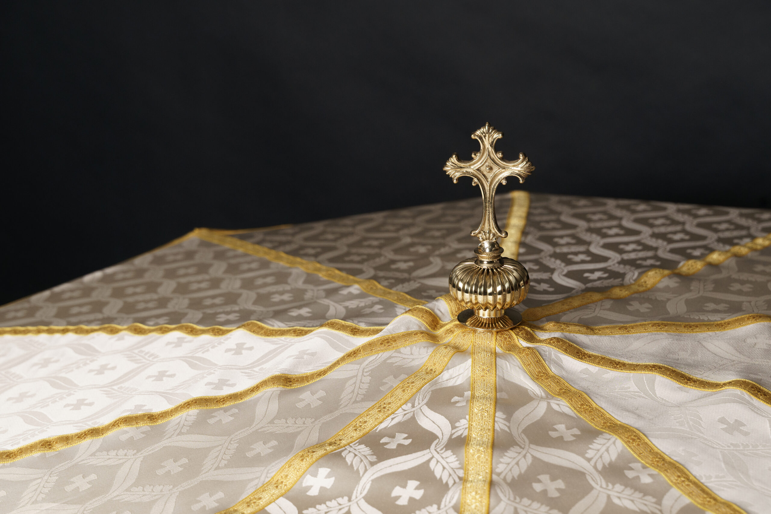 La sommità è ornata da una croce in ottone lavorato, simbolo di devozione e spiritualità. I bordi dell’ombrellino sono rifiniti con frange decorative che donano movimento e ricchezza visiva durante la processione.