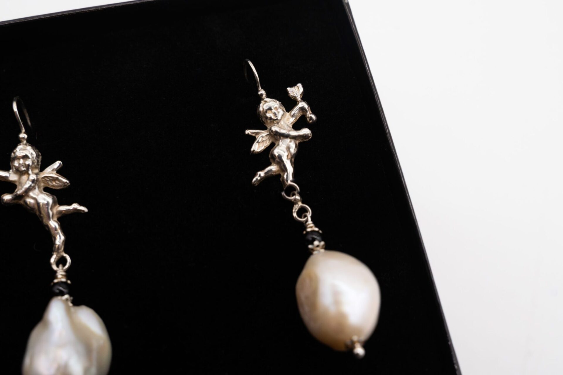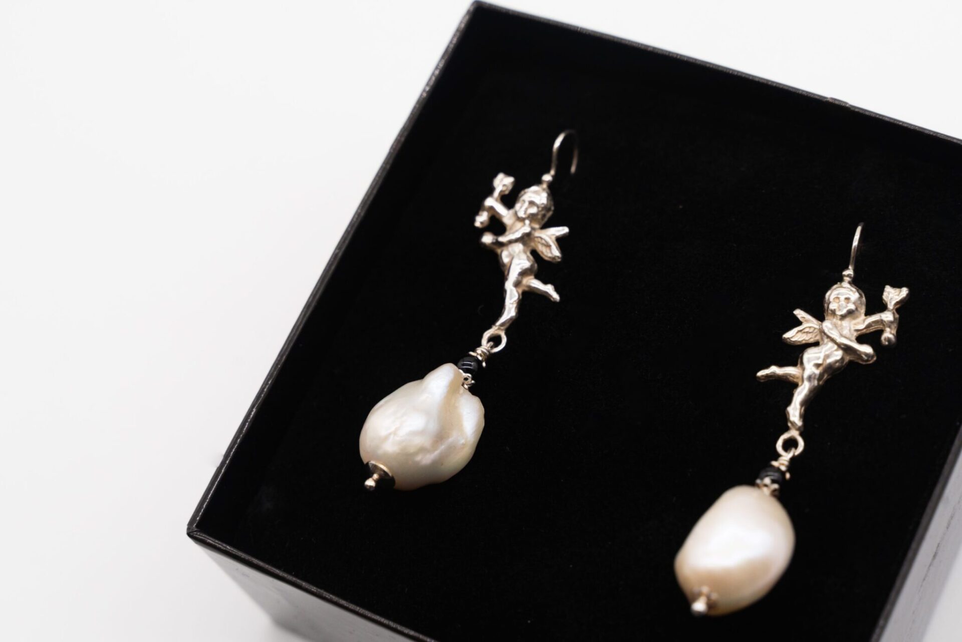 Orecchini a forma di “Putti alati” in argento a cera persa, e perla barocca e onice.