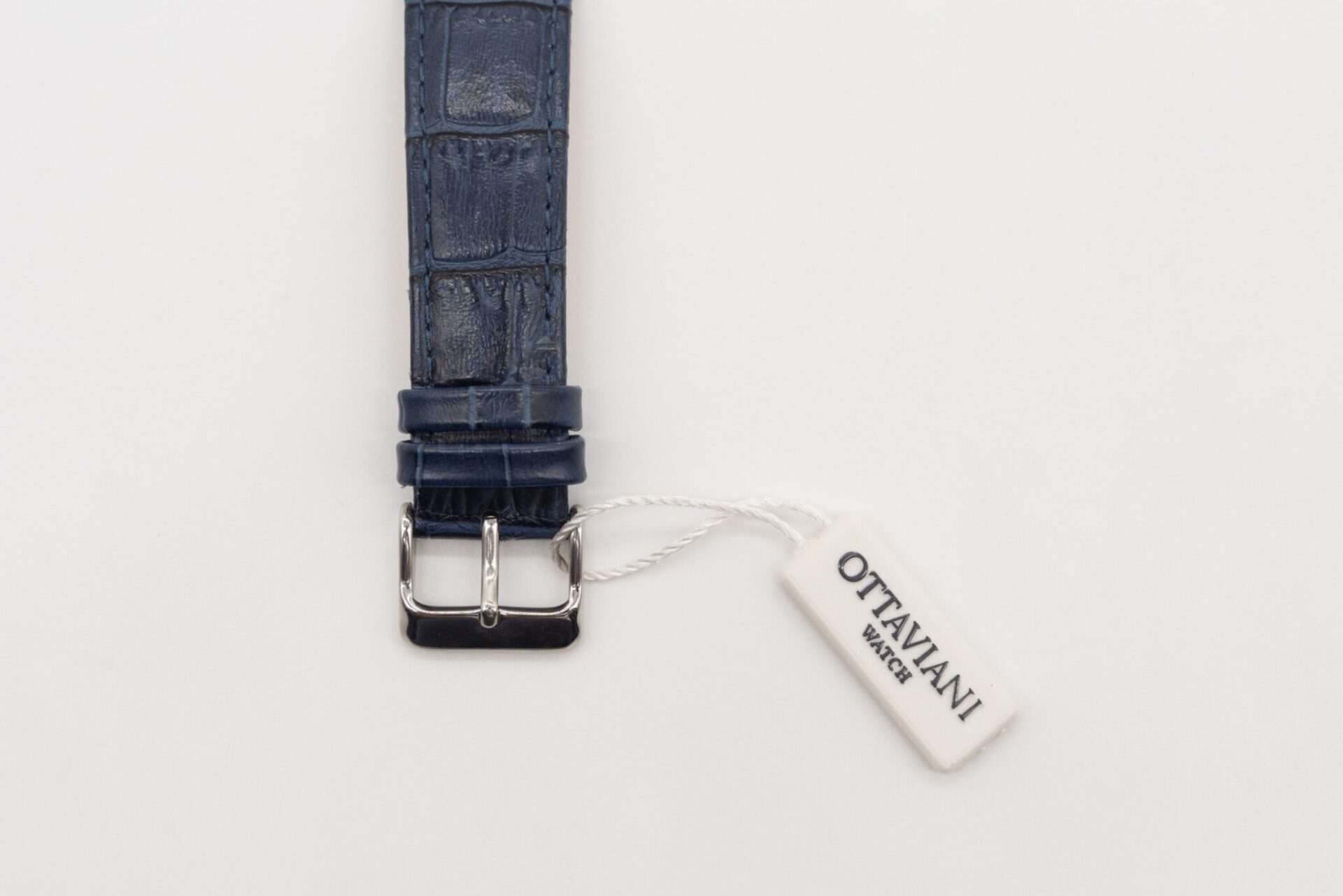 CINTURINO: vera pelle blu effetto coccodrillo e fibbia ad artiglione in acciaio personalizzata.