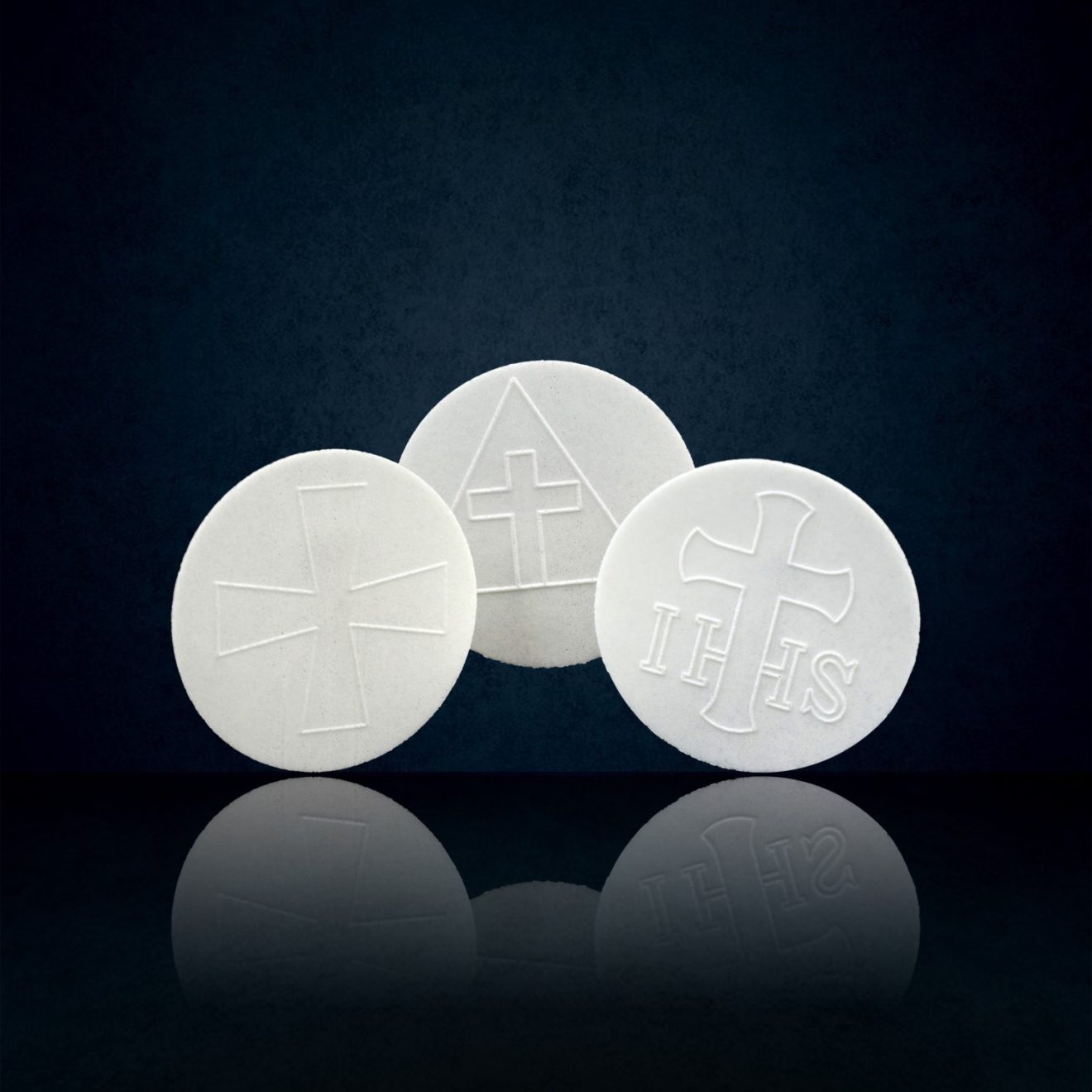 Ostie Eucaristiche per la Consacrazione dell’Eucaristia celebrata dal sacerdote durante la Santa Messa, dal bordo chiuso per una minore dispersione di frammenti. Sono realizzate con estrema attenzione, seguendo scrupolosamente le regole canoniche di preparazione.