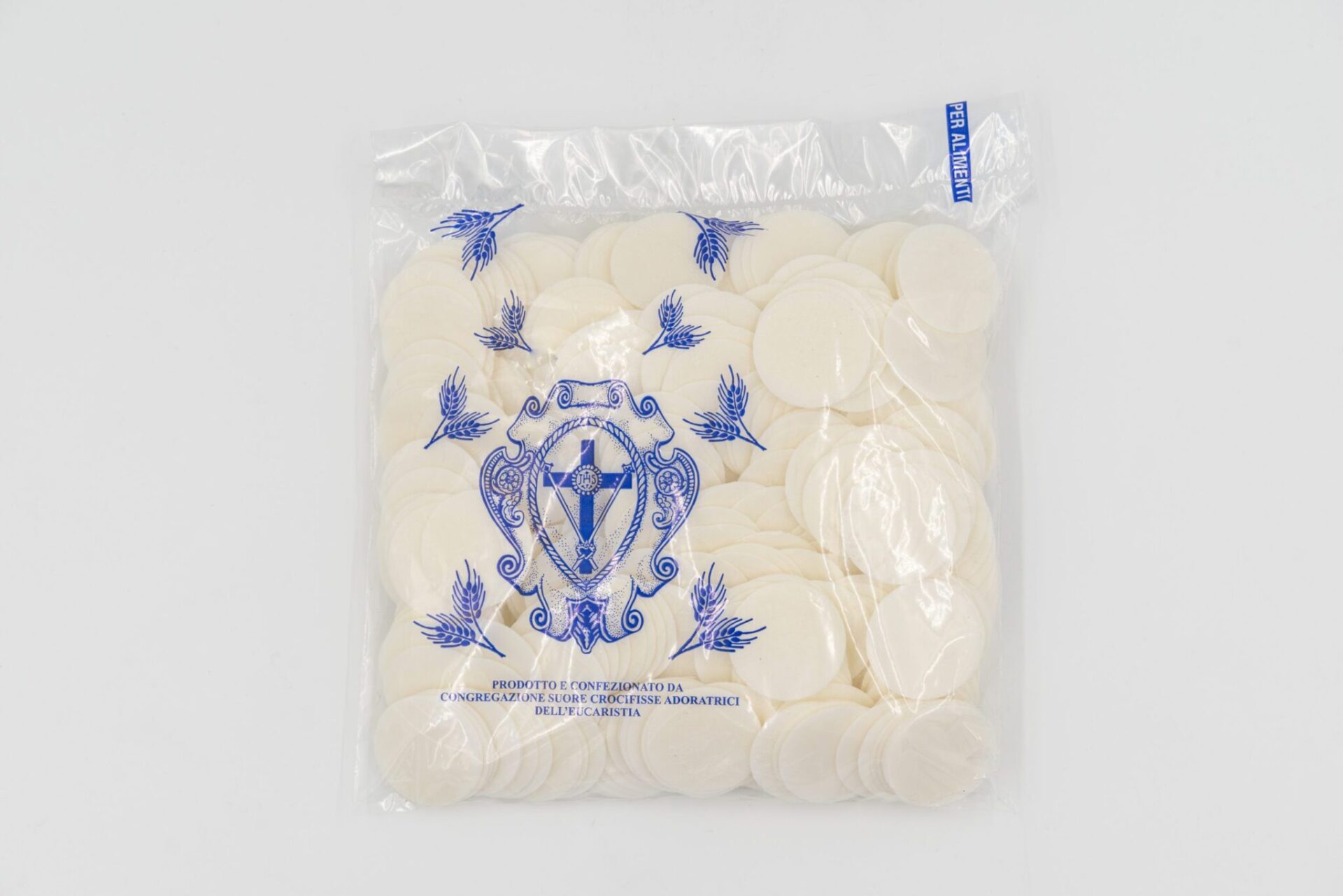 Ostie Eucaristiche per la Consacrazione dell’Eucaristia celebrata dal sacerdote durante la Santa Messa, dal bordo chiuso per una minore dispersione di frammenti. Sono realizzate con estrema attenzione, seguendo scrupolosamente le regole canoniche di preparazione.