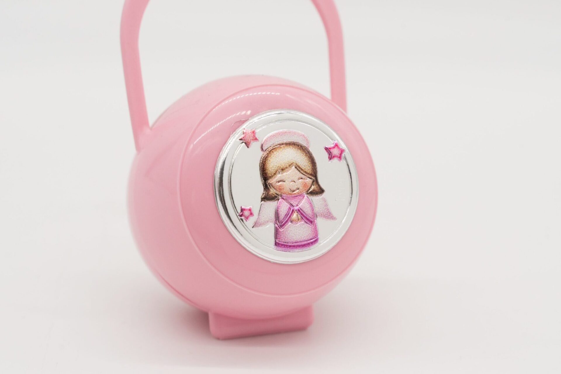 Portaciuccio in policarbonato rosa e angioletto in argento.