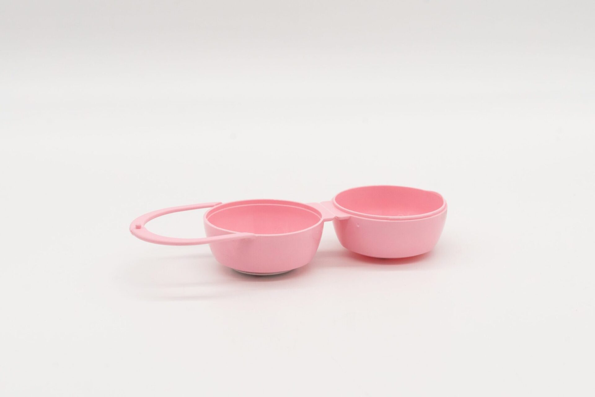 Portaciuccio di colore rosa con una forma sferica e un manico ad arco nella parte superiore.
