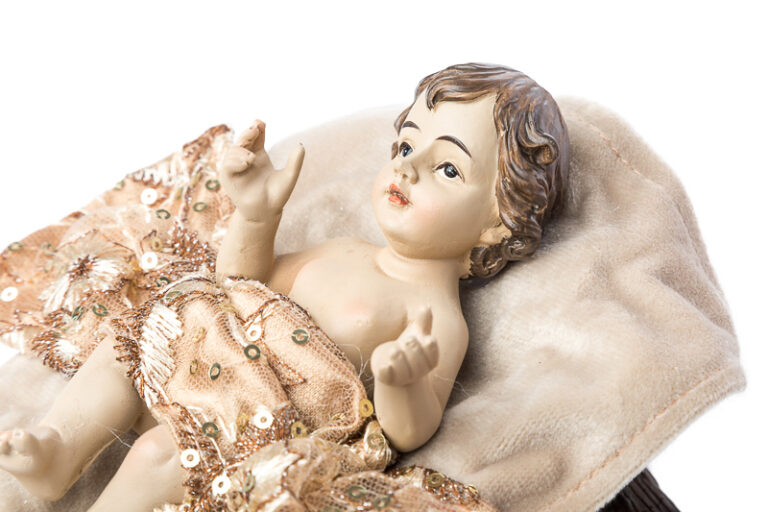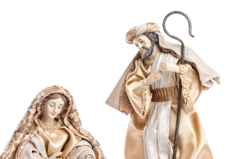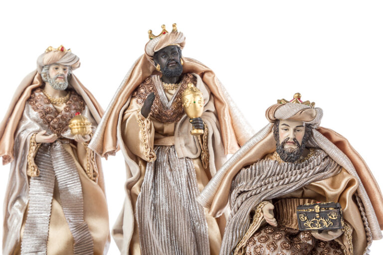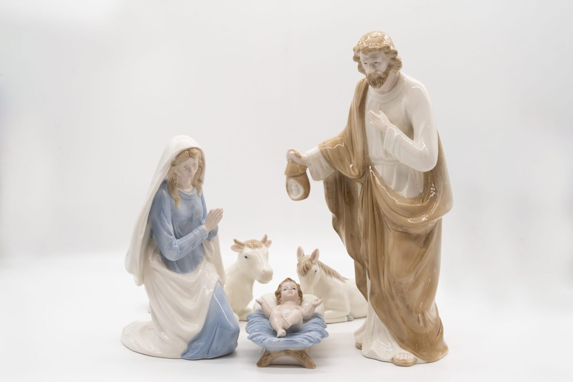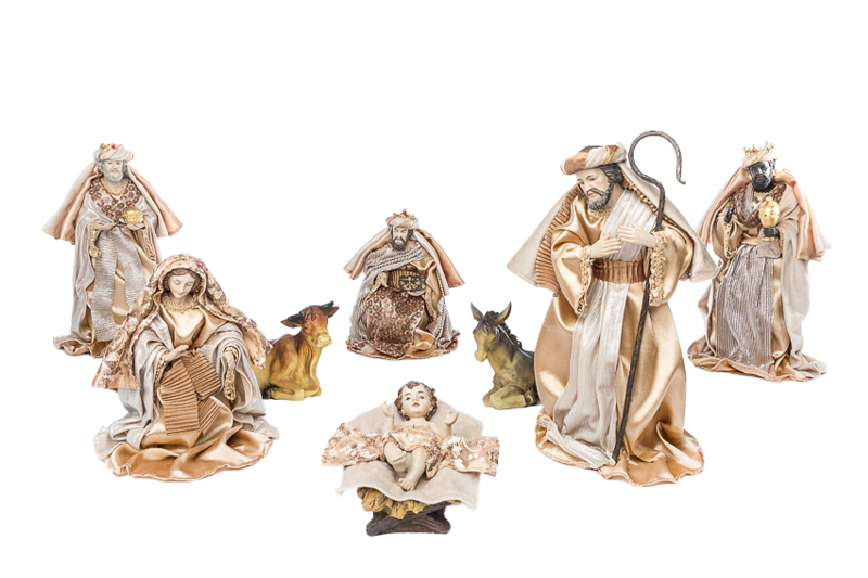Presepe completo realizzato in resina con abiti beige e dettagli dorati, completo da 8 pezzi con asinello, bue e Re Magi.