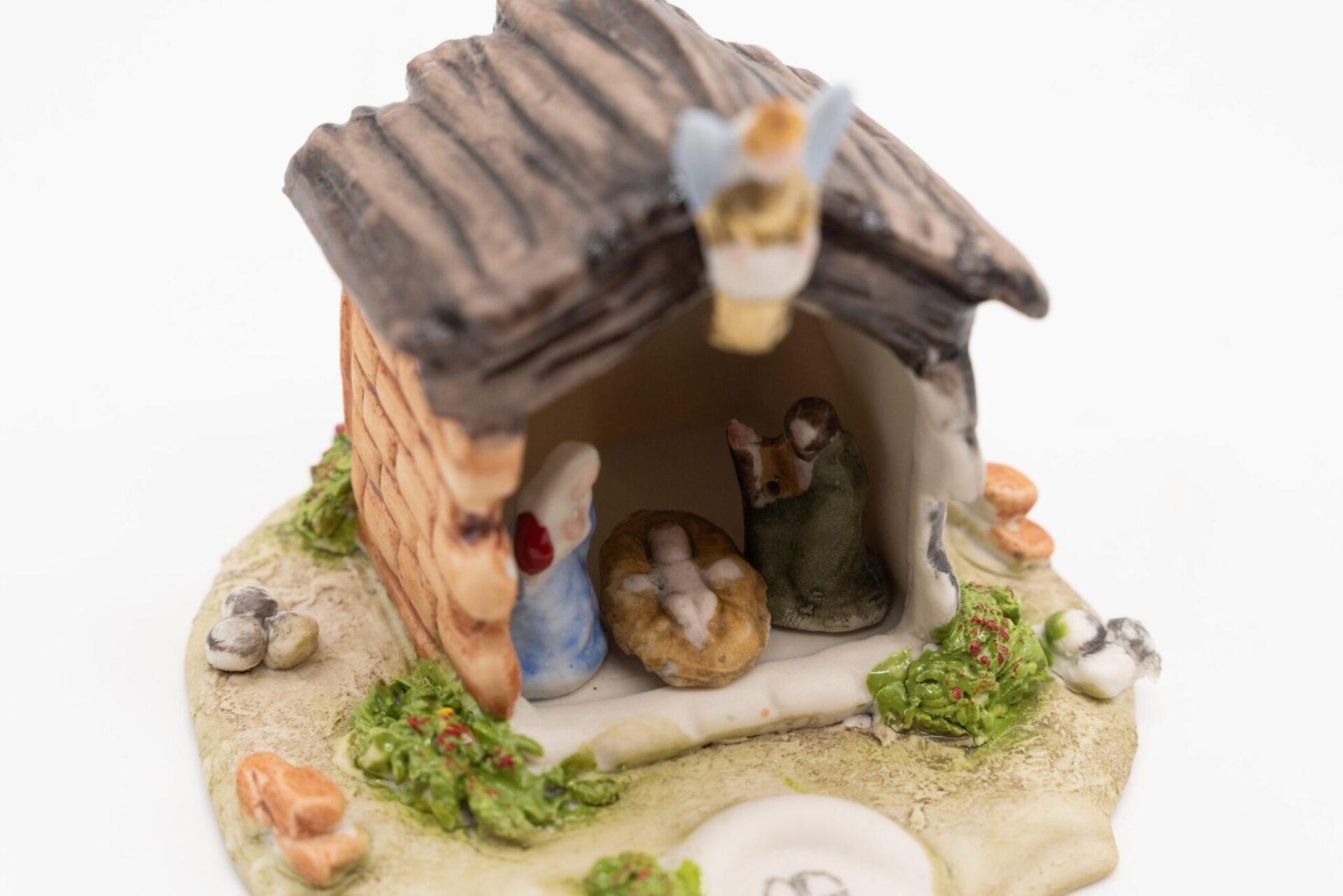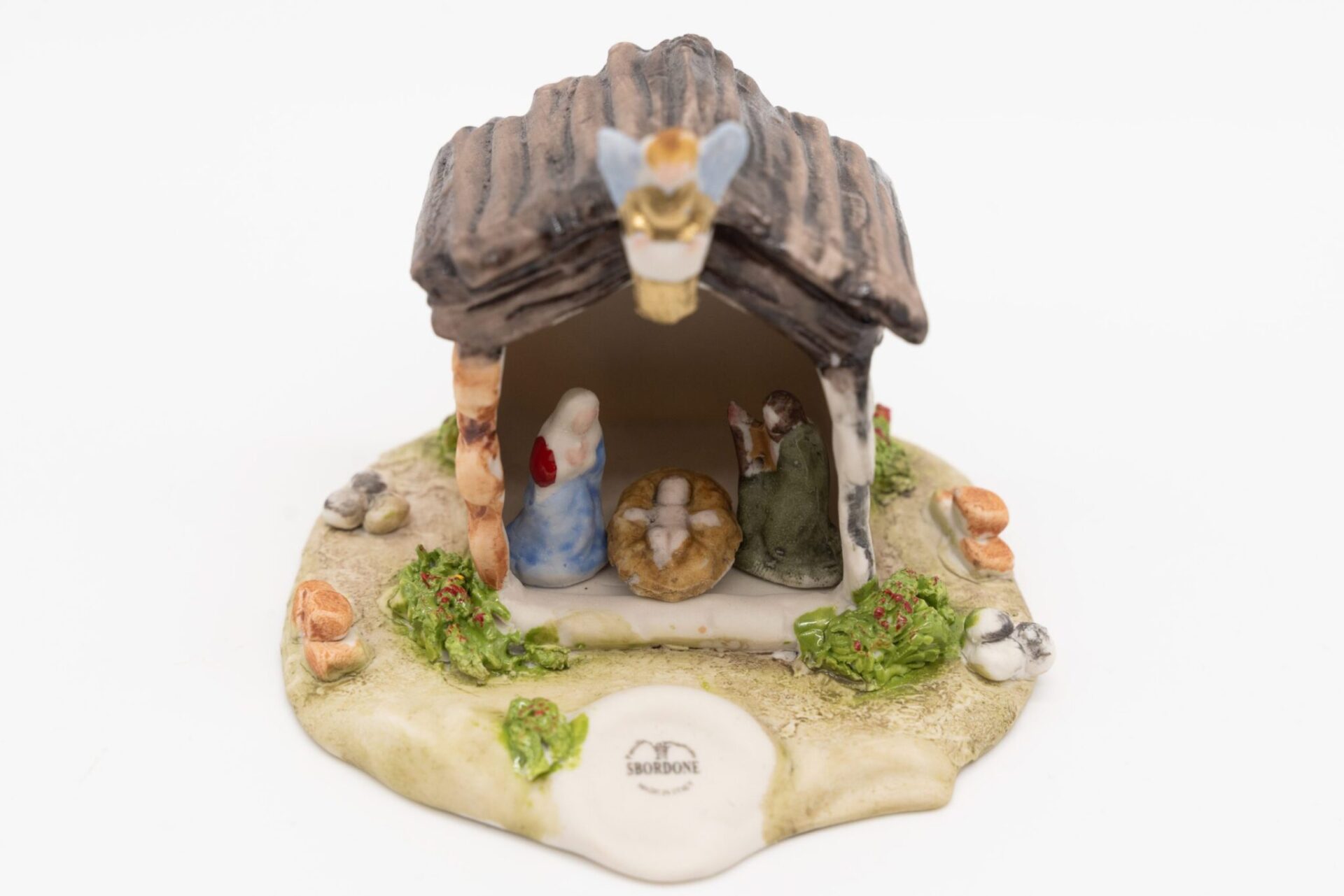 Presepe con capanna artigianale in porcellana Capodimonte, interamente decorato a pennello con la tecnica del terzo fuoco, cosi chiamata in quanto la porcellana che viene decorata subisce tre cotture.