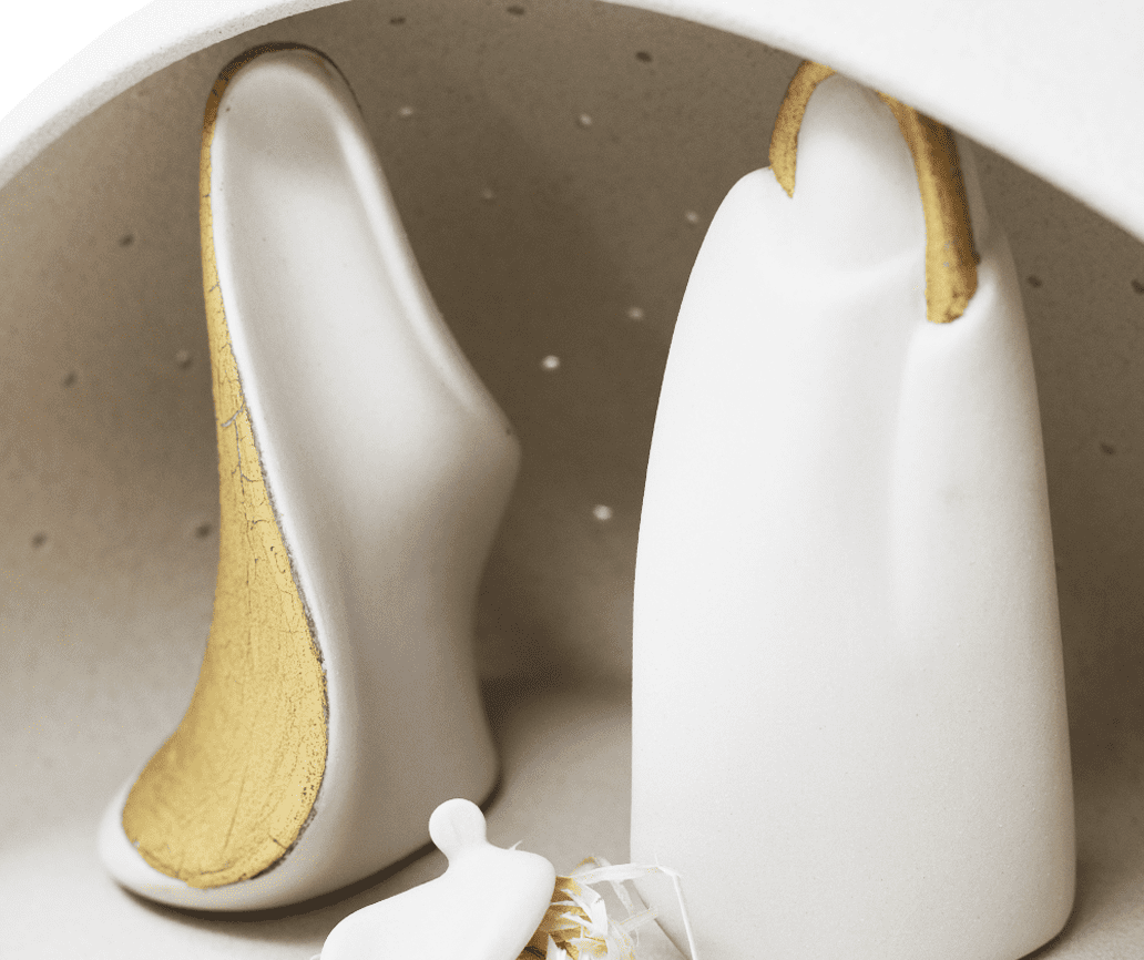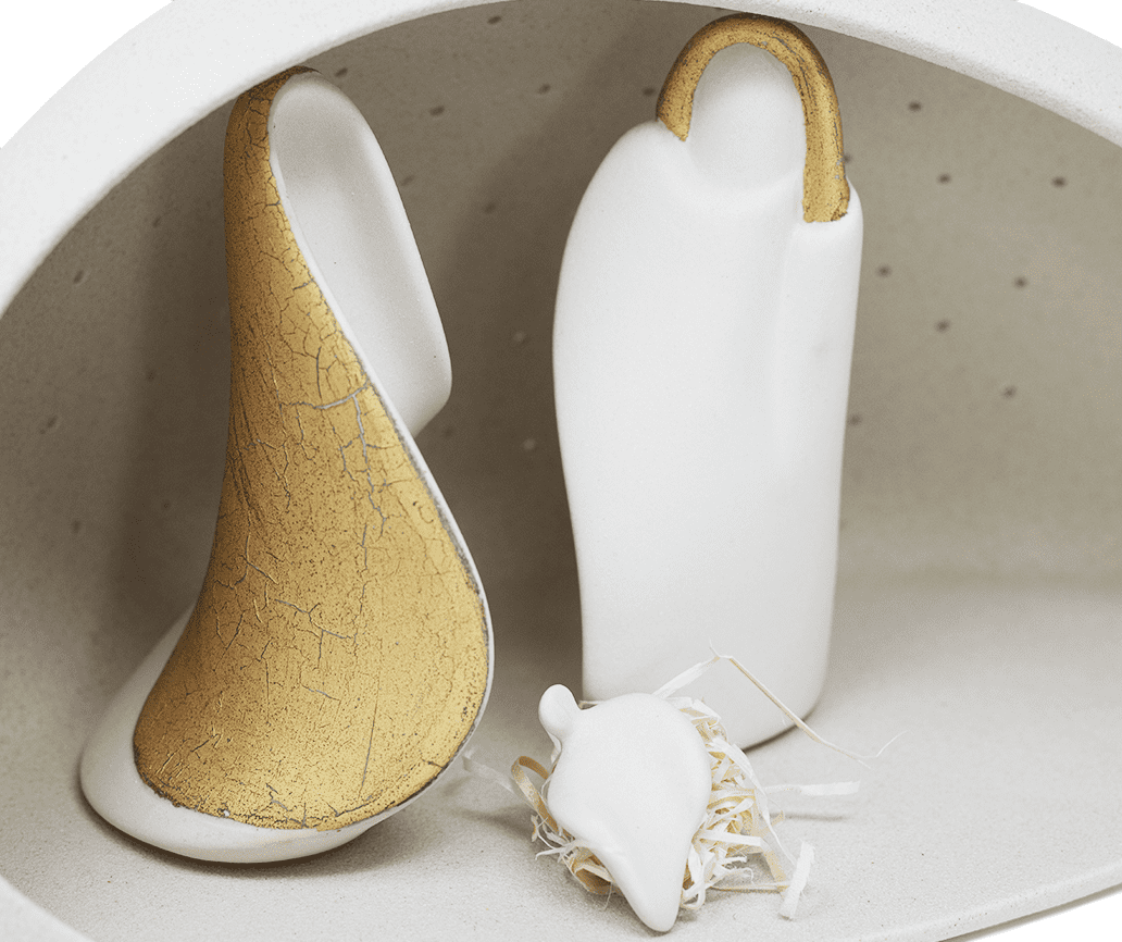 La famiglia di Nazareth è avvolta dalla capanna con esclusivi dettagli in oro che delineano le figure.