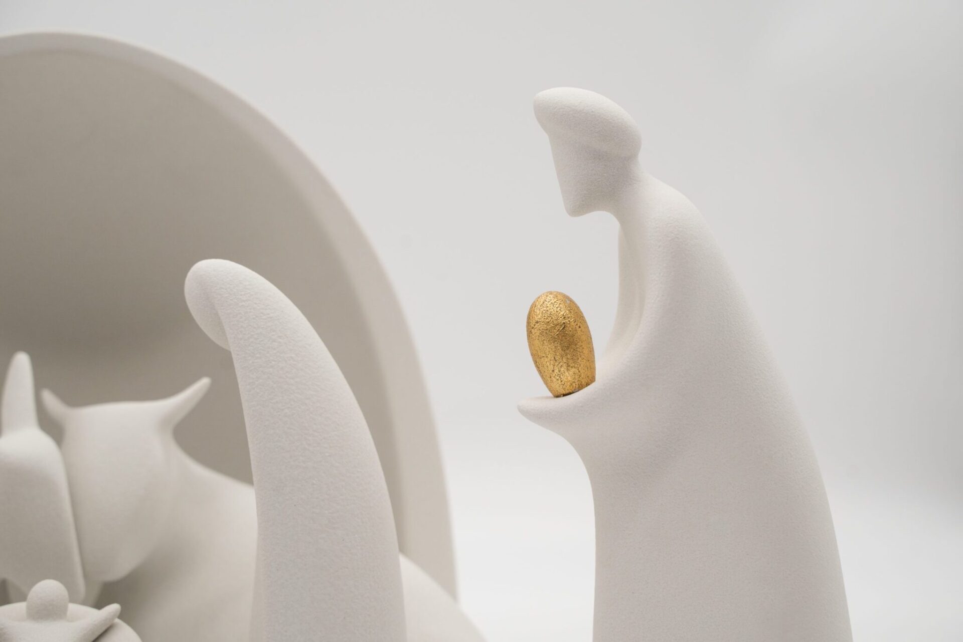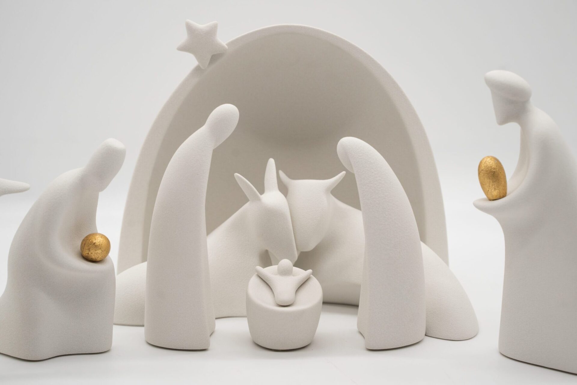 Presepe completo otto sculture con capanna color Latte e dettagli doni dei Re Magi oro 24 kt.