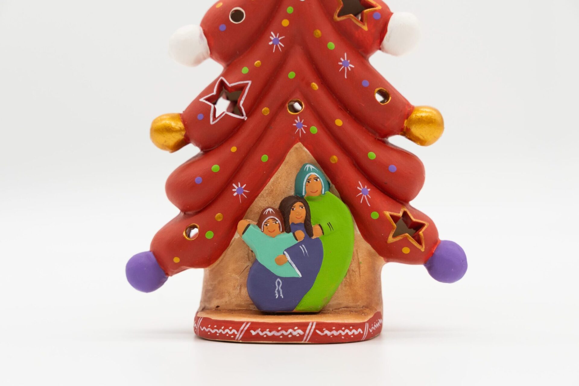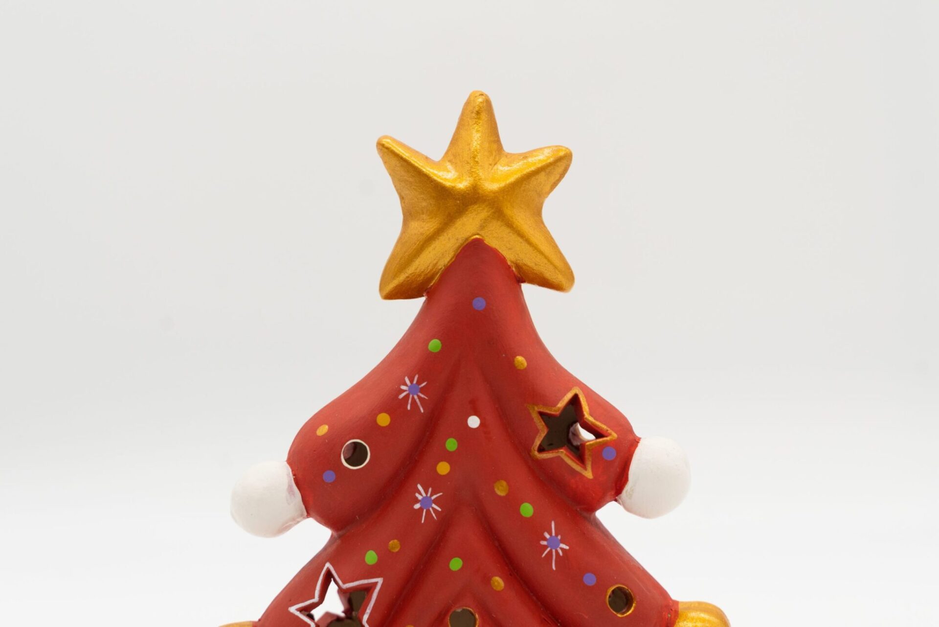 È realizzato in terracotta e dipinto a mano. La struttura principale è un albero di Natale di colore rosso, decorato con una stella dorata sulla cima.