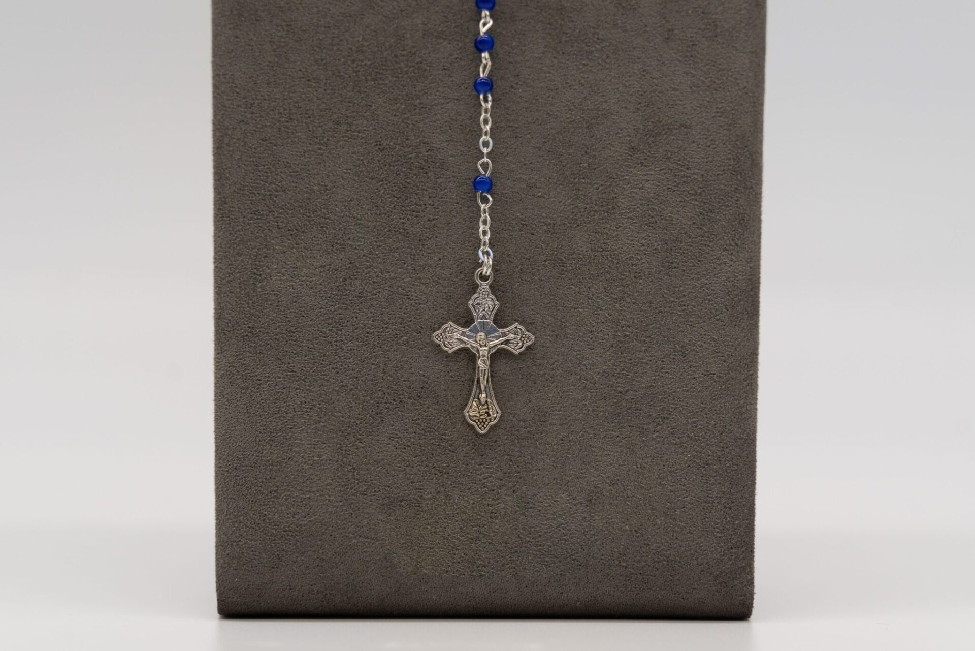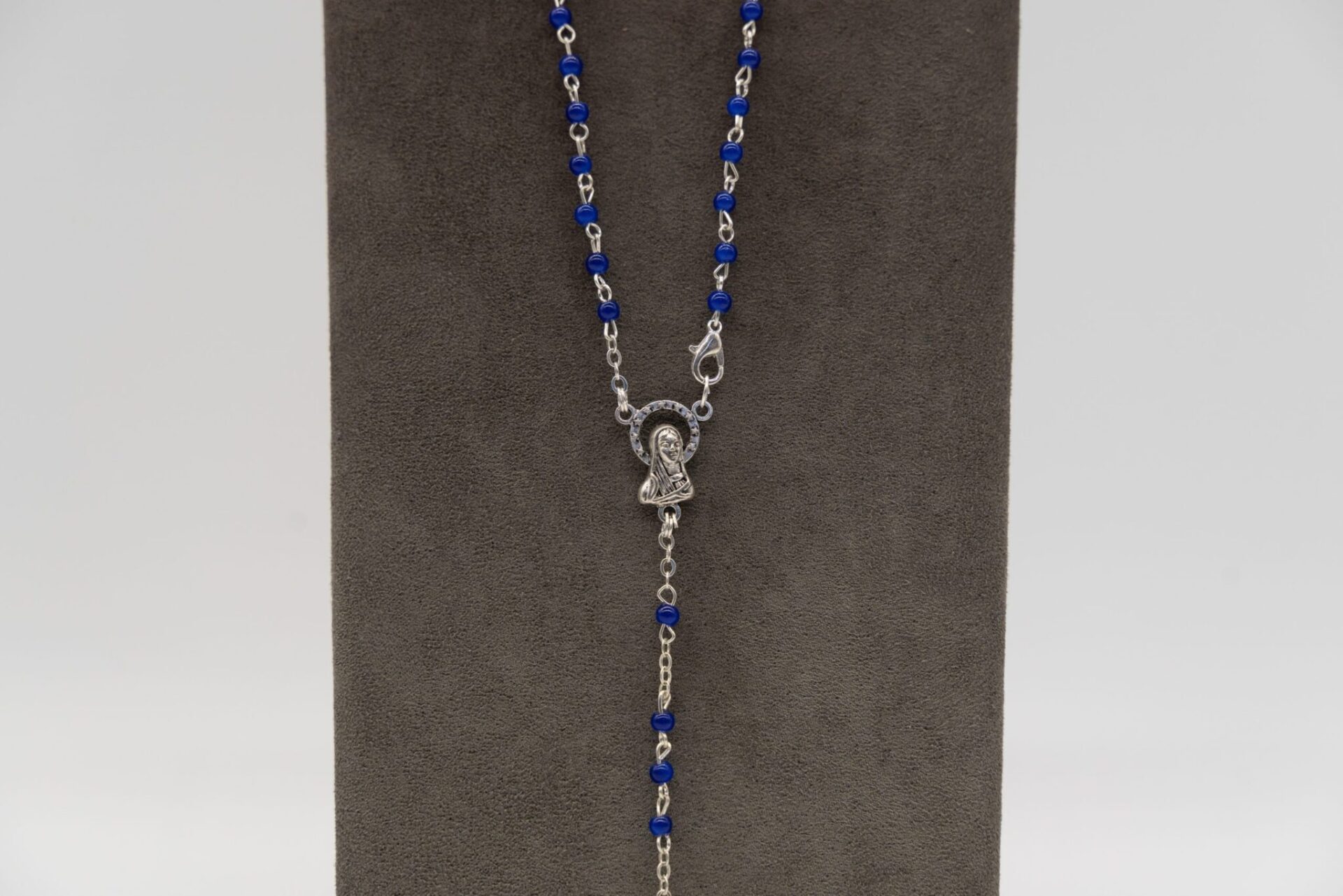 Il rosario è composto da piccoli grani blu lucidi, disposti lungo una catena metallica.