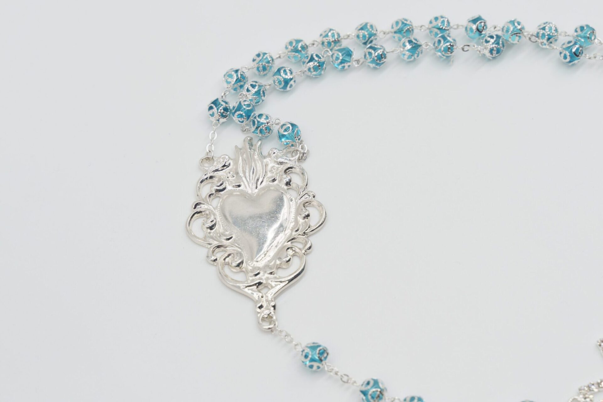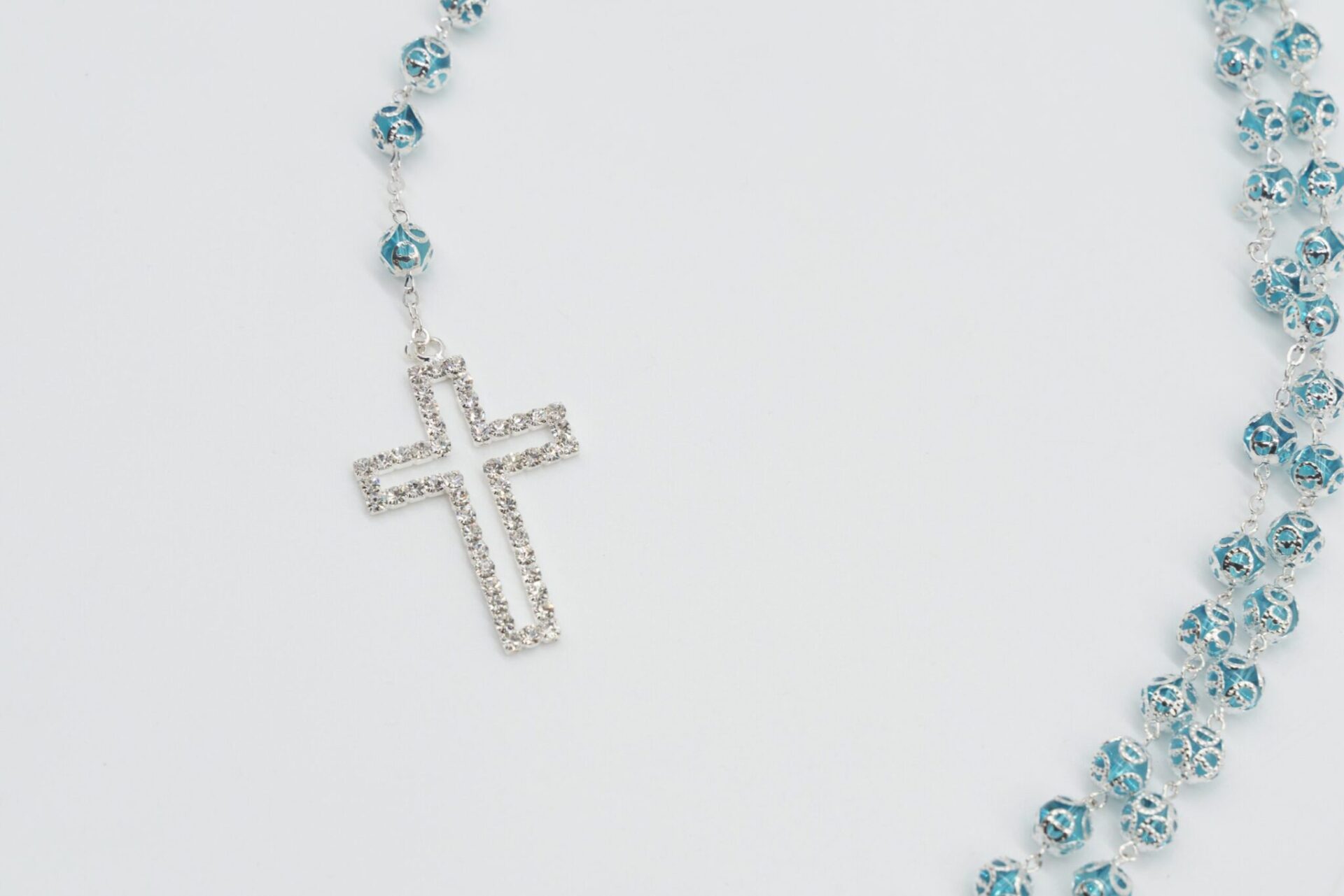 Rosario Ex Voto in cristallo azzurro, croce con strass e grano con coppiglia del diametro di 8 mm, realizzato in Italia.