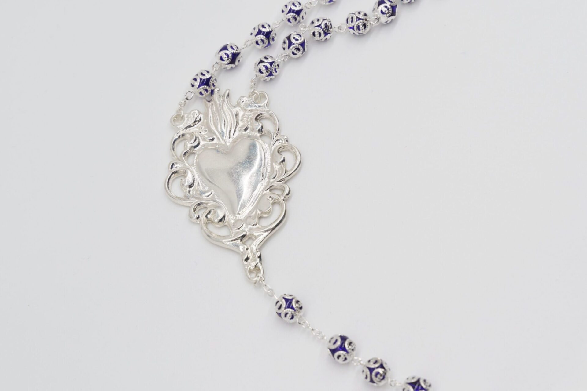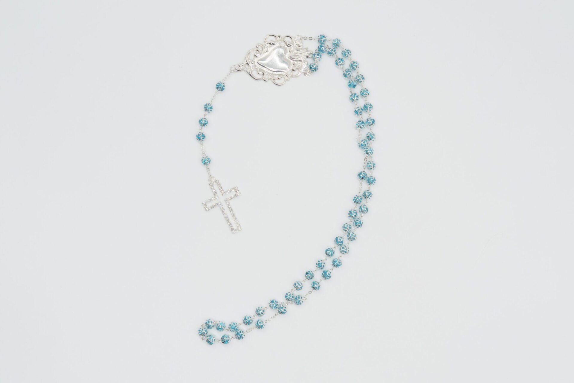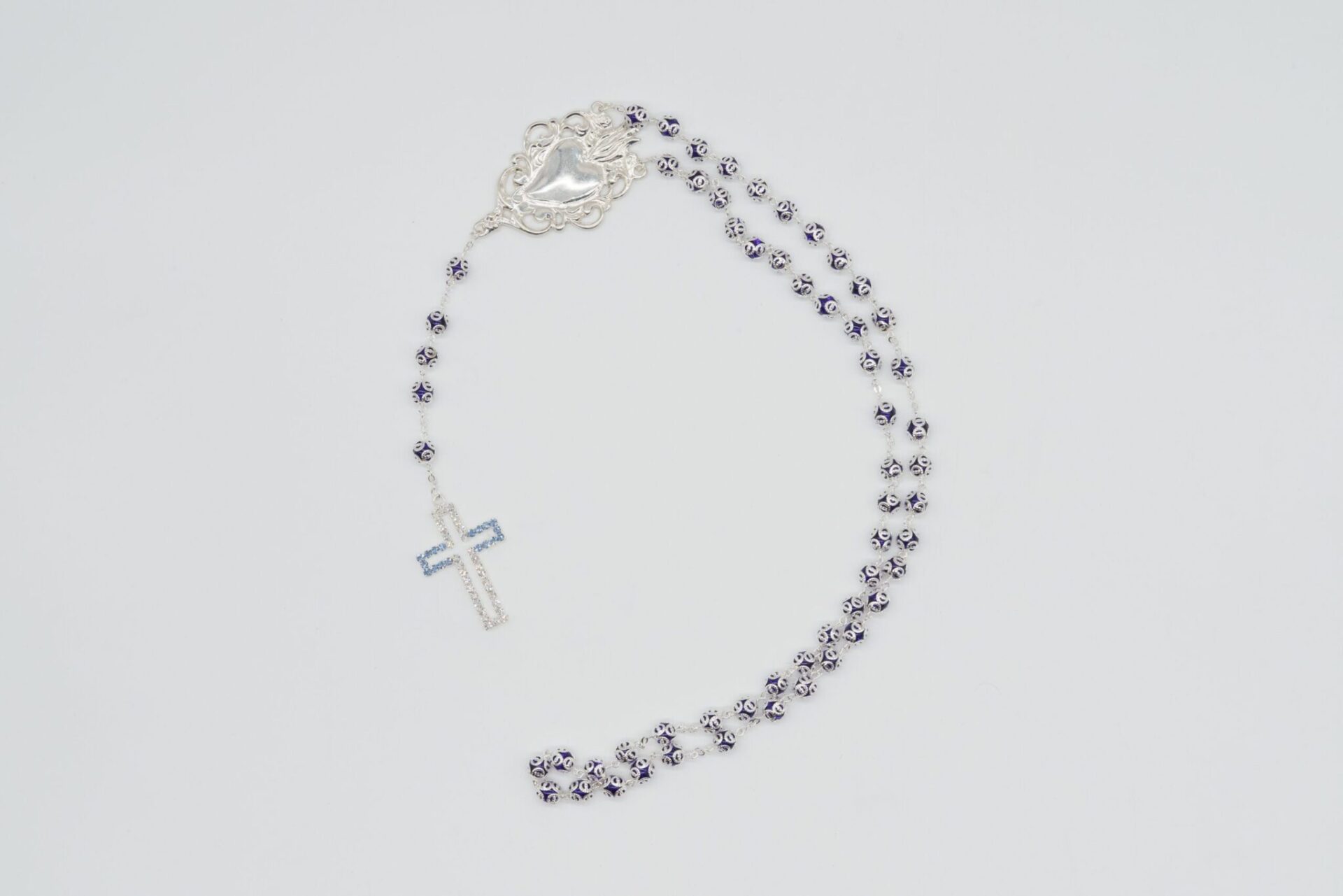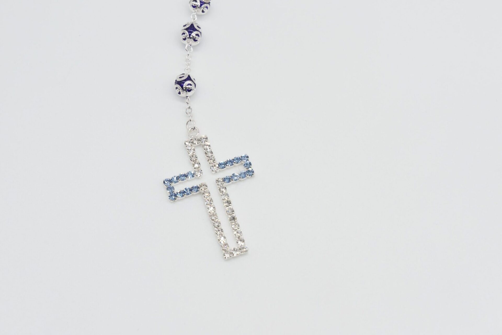 Rosario Ex Voto in cristallo blu, croce con strass e grano con coppiglia del diametro di 8 mm, realizzato in Italia.