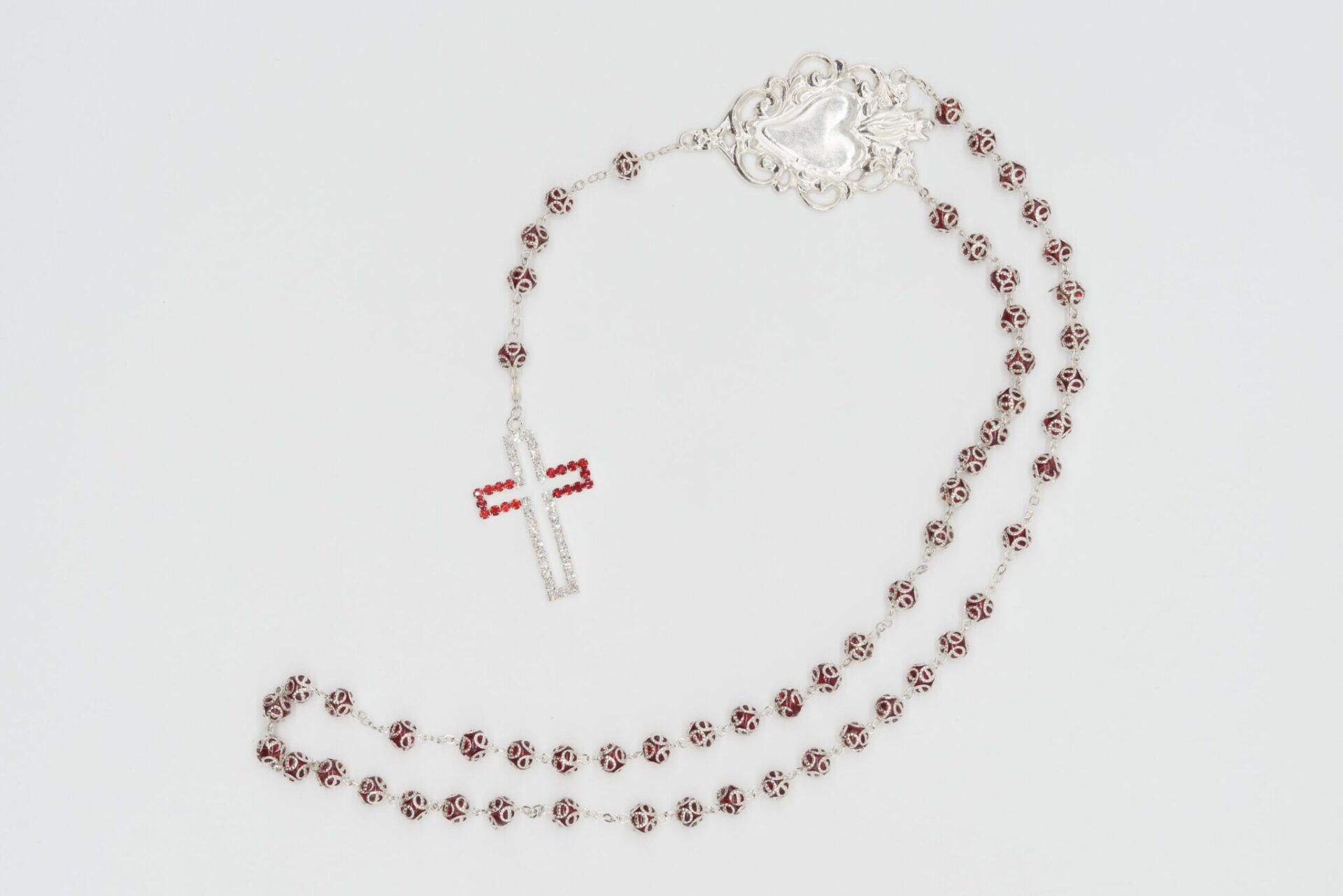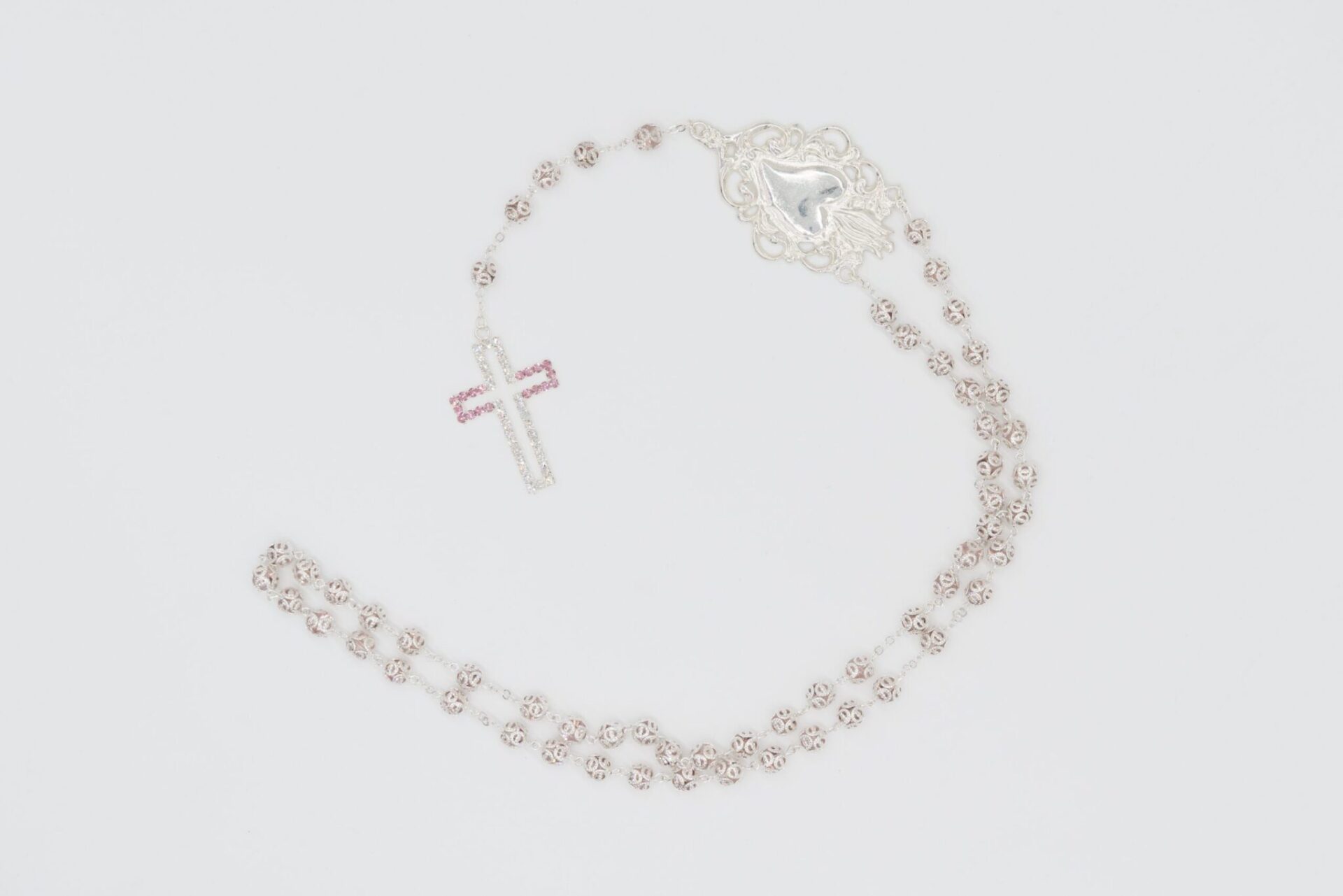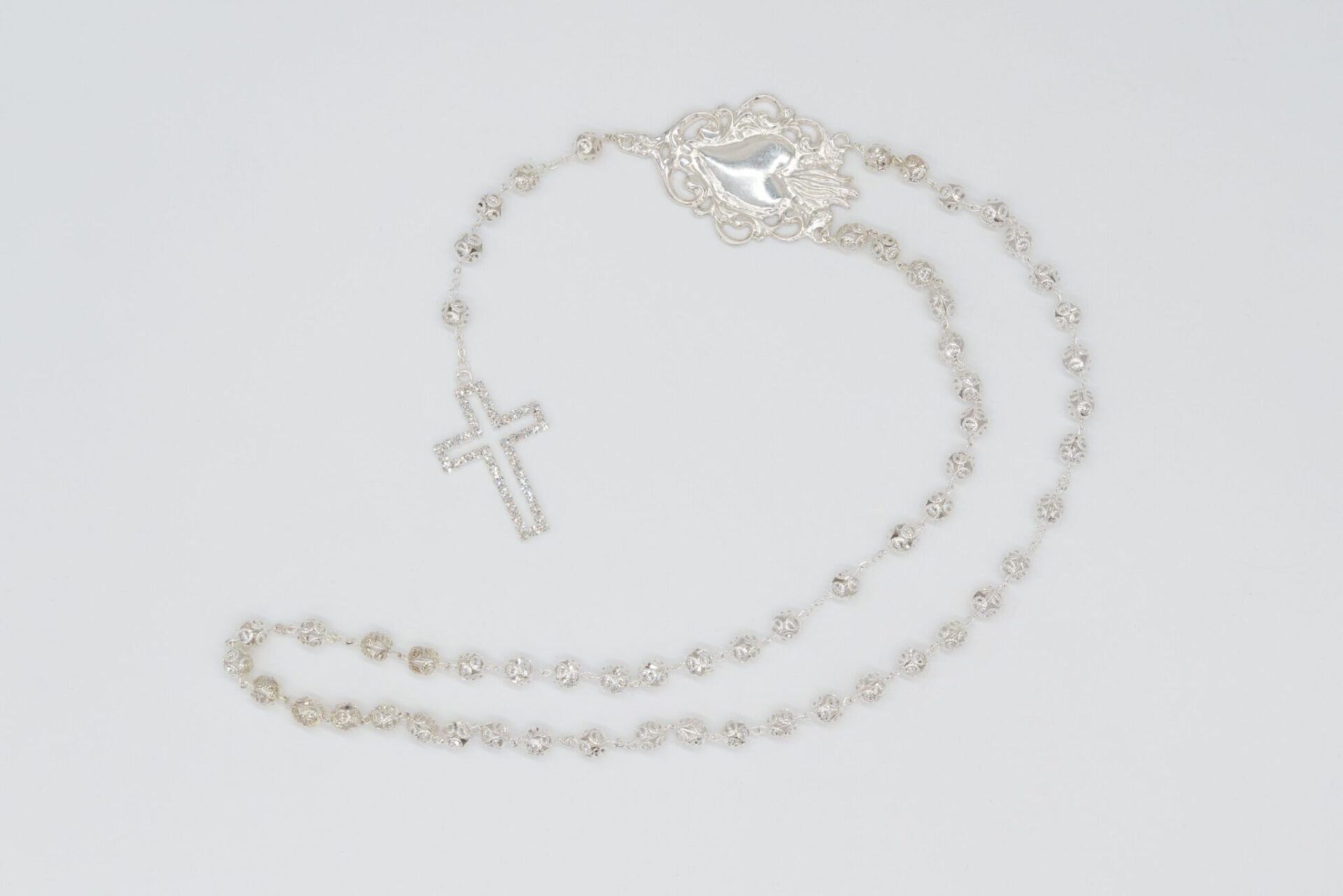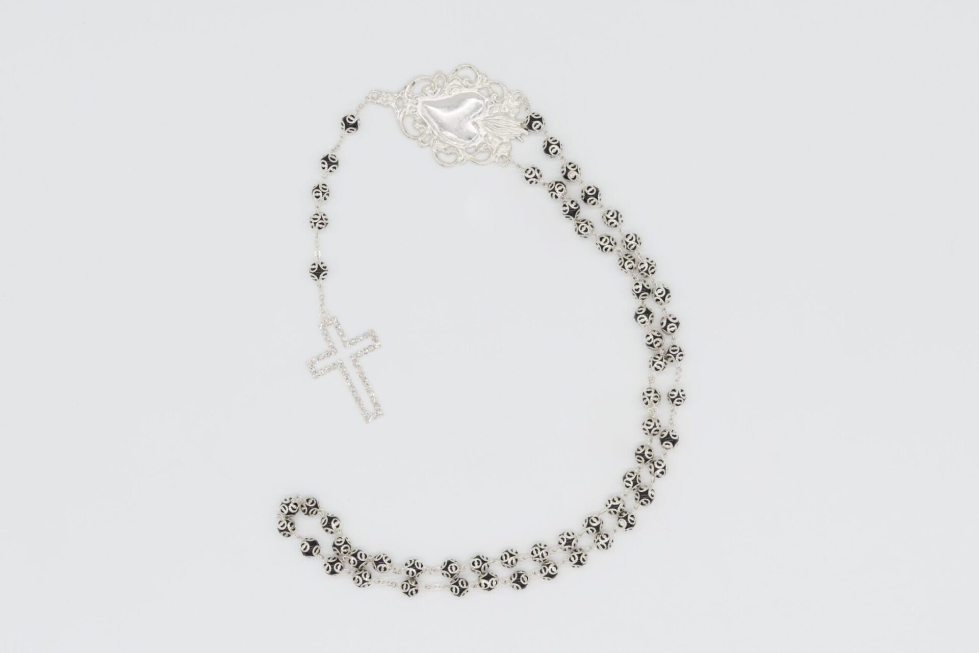 Rosario Ex Voto in cristallo blu, croce con strass e grano con coppiglia del diametro di 8 mm, realizzato in Italia.